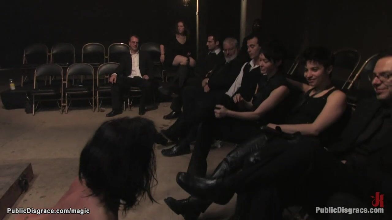 Description: Stunning French brunette slave Cecilia Vega with neck trapped in board gets groped then in inverted suspension fucked in public place