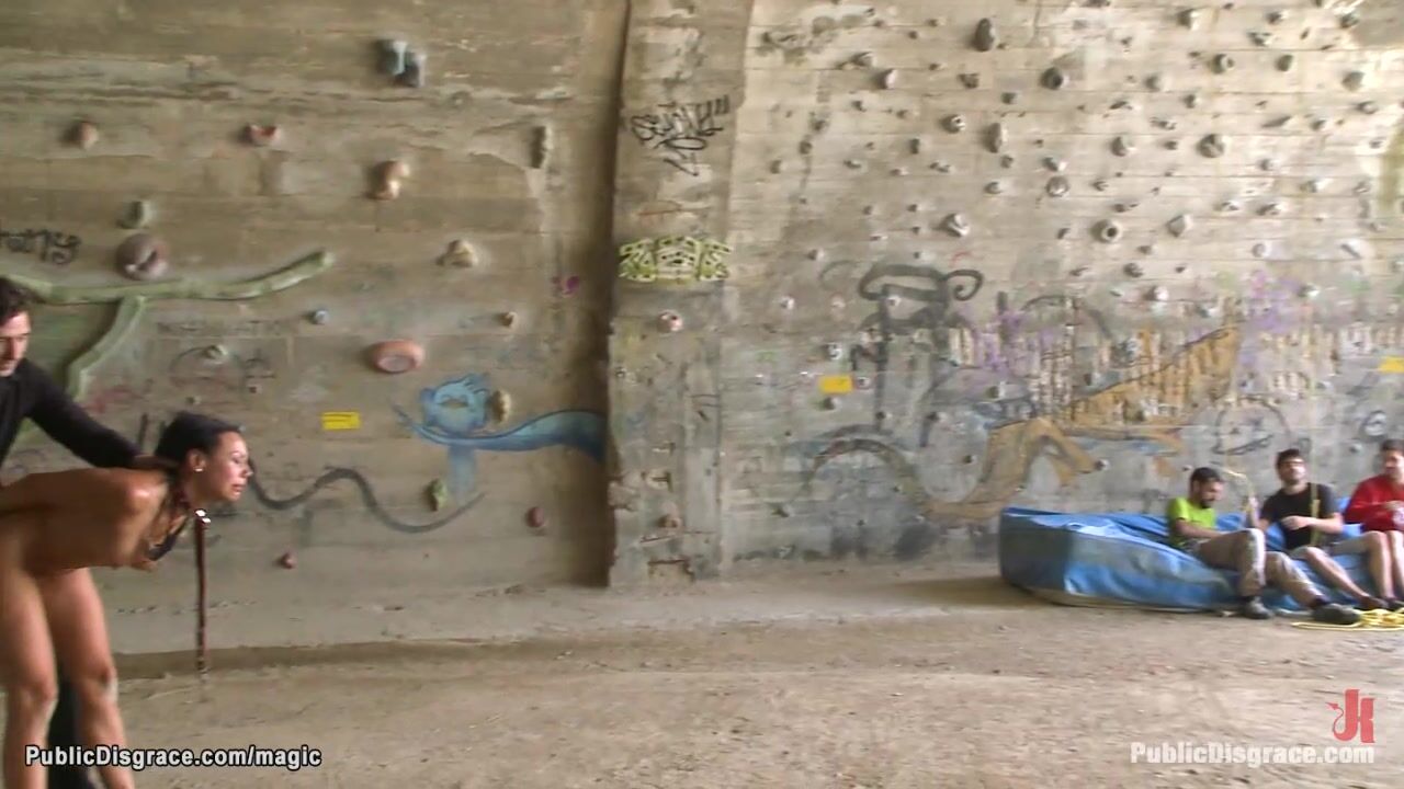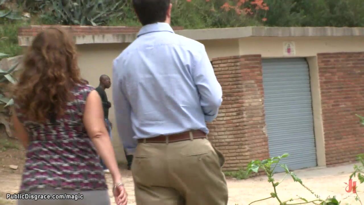 Description: Sexy brunette Latina babe Lara Tinelli on knees with bound hands behind gets deep throat fucked then banged by big cock master Steve Holmes outdoor in public