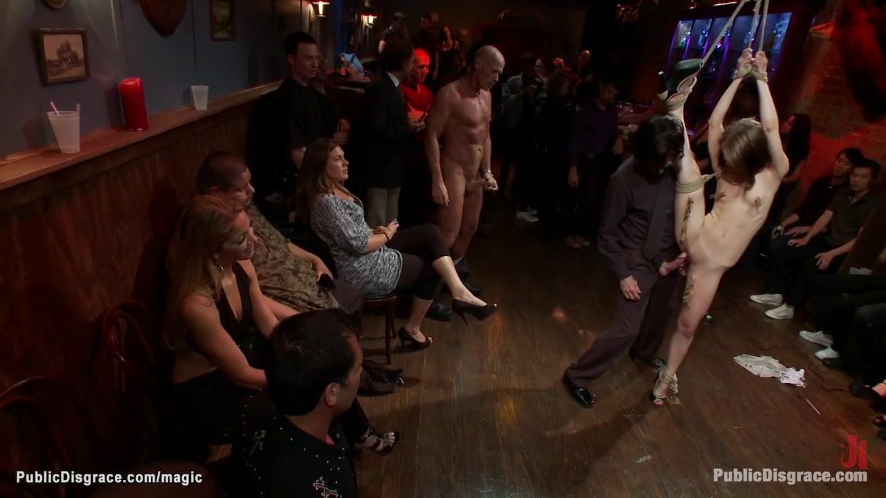 Description: Flexible skinny brunette slave Sensi Pearl is bound with hands and one leg in the air and fucked then gang banged by big cocks in public