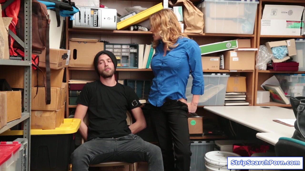 A male shoplifter tries making a deal with the female security guard to avoid calling the cops.The big tits milf finds him hot and so she asks him to eat her hairy pussy.The guy does so and then lets her blowjob him before they fuck in the office.