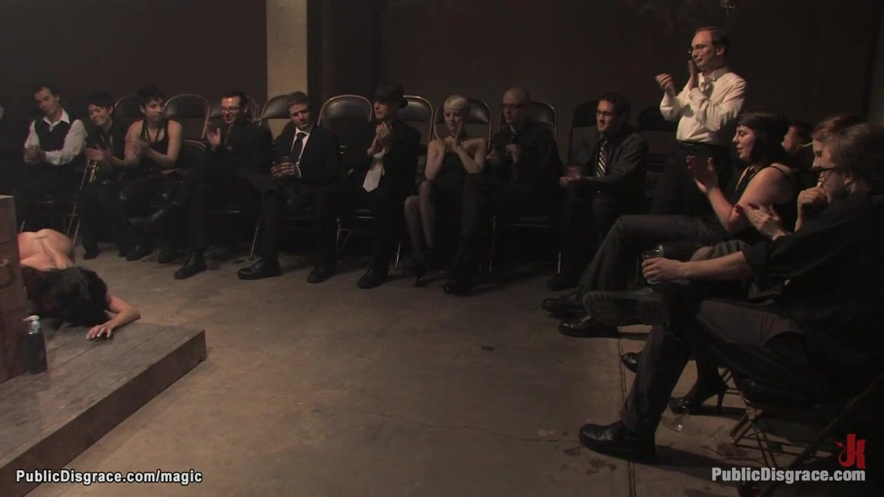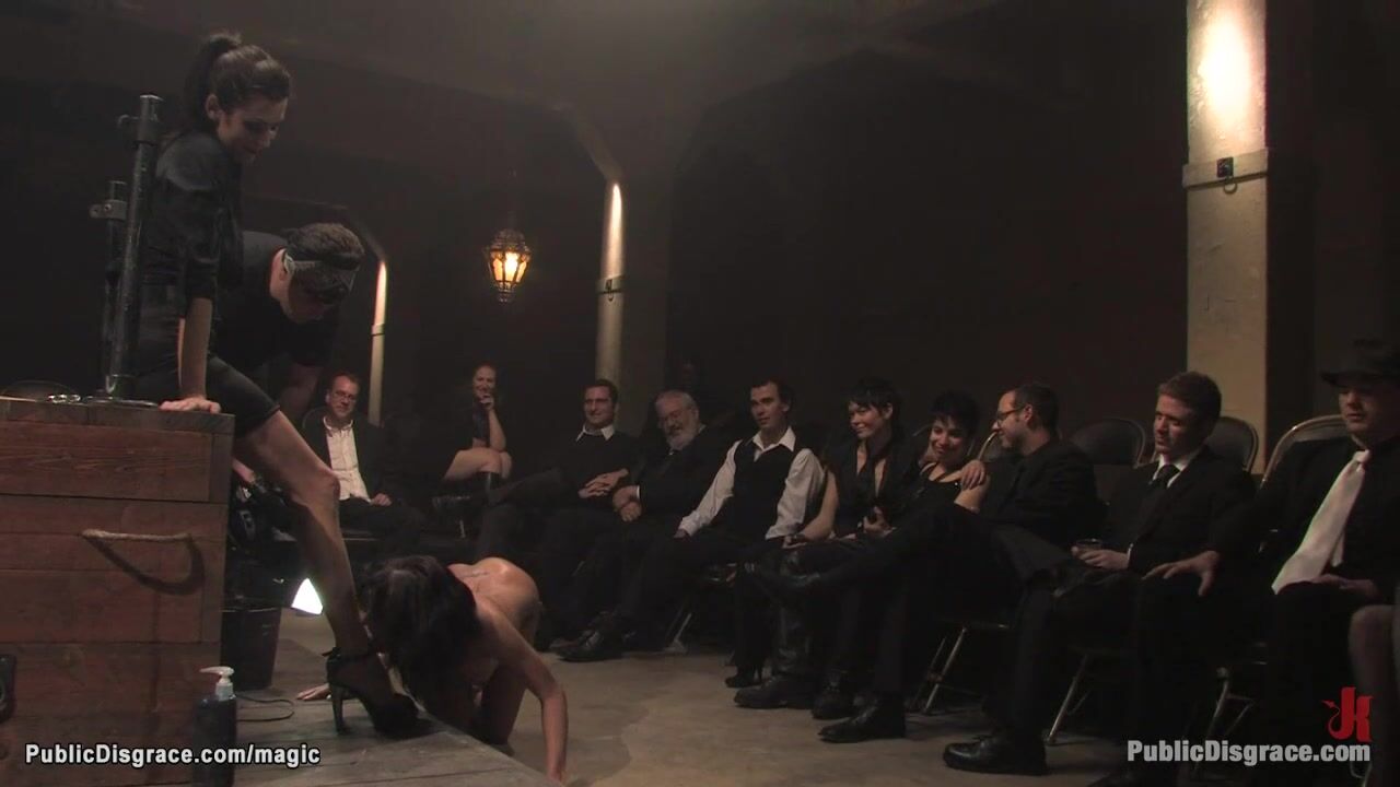 Description: Bound on knees and bent forward with hands in strappado hot brunette French slave Cecilia Vega gets mouth and anal fucked in public by big cock John Strong