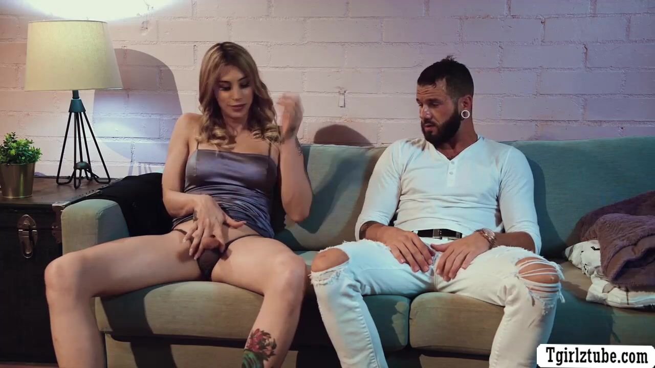 Sexy blonde Tgirl brings her boyfriend into her place and then they start stroking their big cocks on the couch.After that,she throats her boyfriends hard dick passionately and in return,the guy licks her ass first and barebacks it so hard.