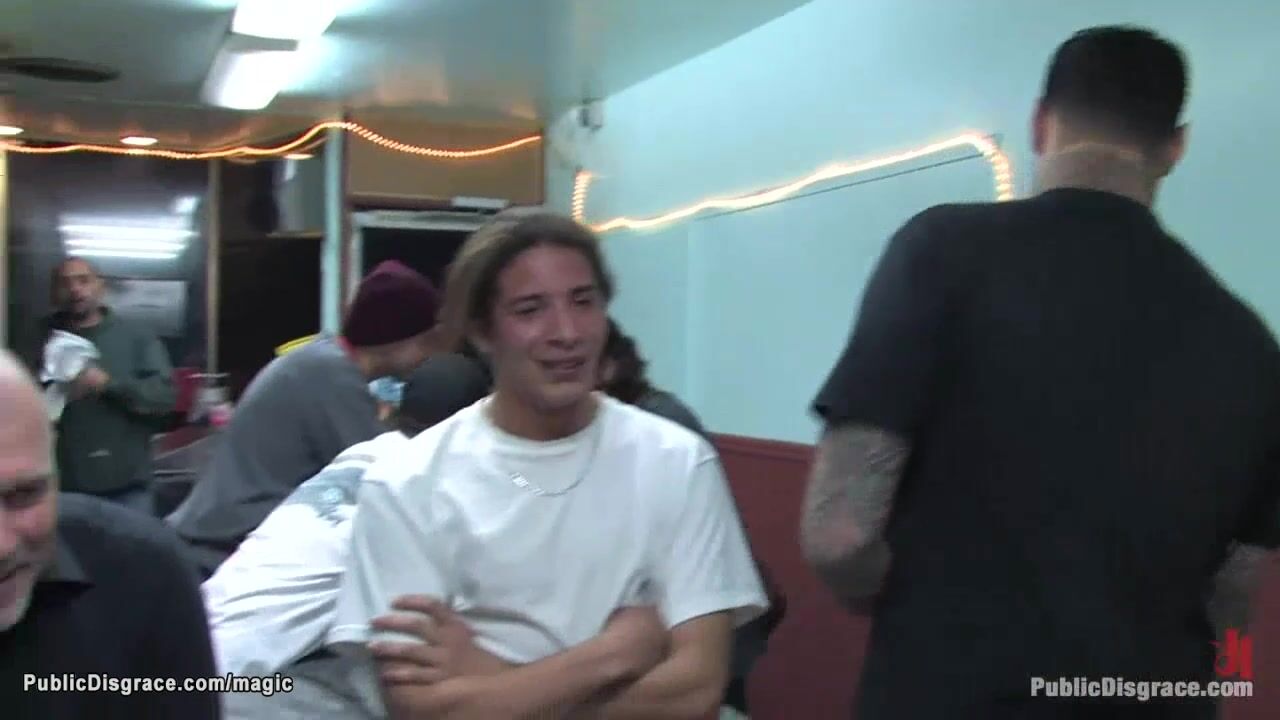 Description: Dirty babe Delilah Knight broungt by Mark Davis and Princess Donna Dolore on a lesh in public restaurant where gets humiliated and fucked by big cocks