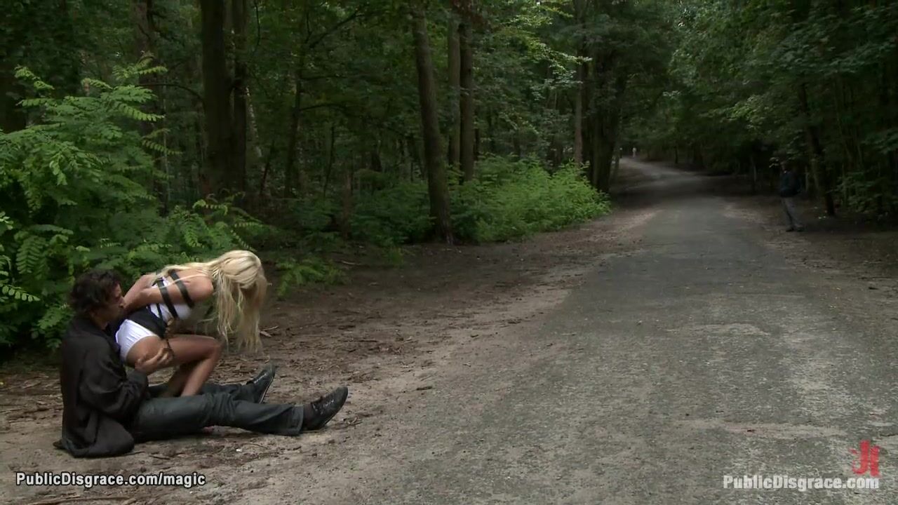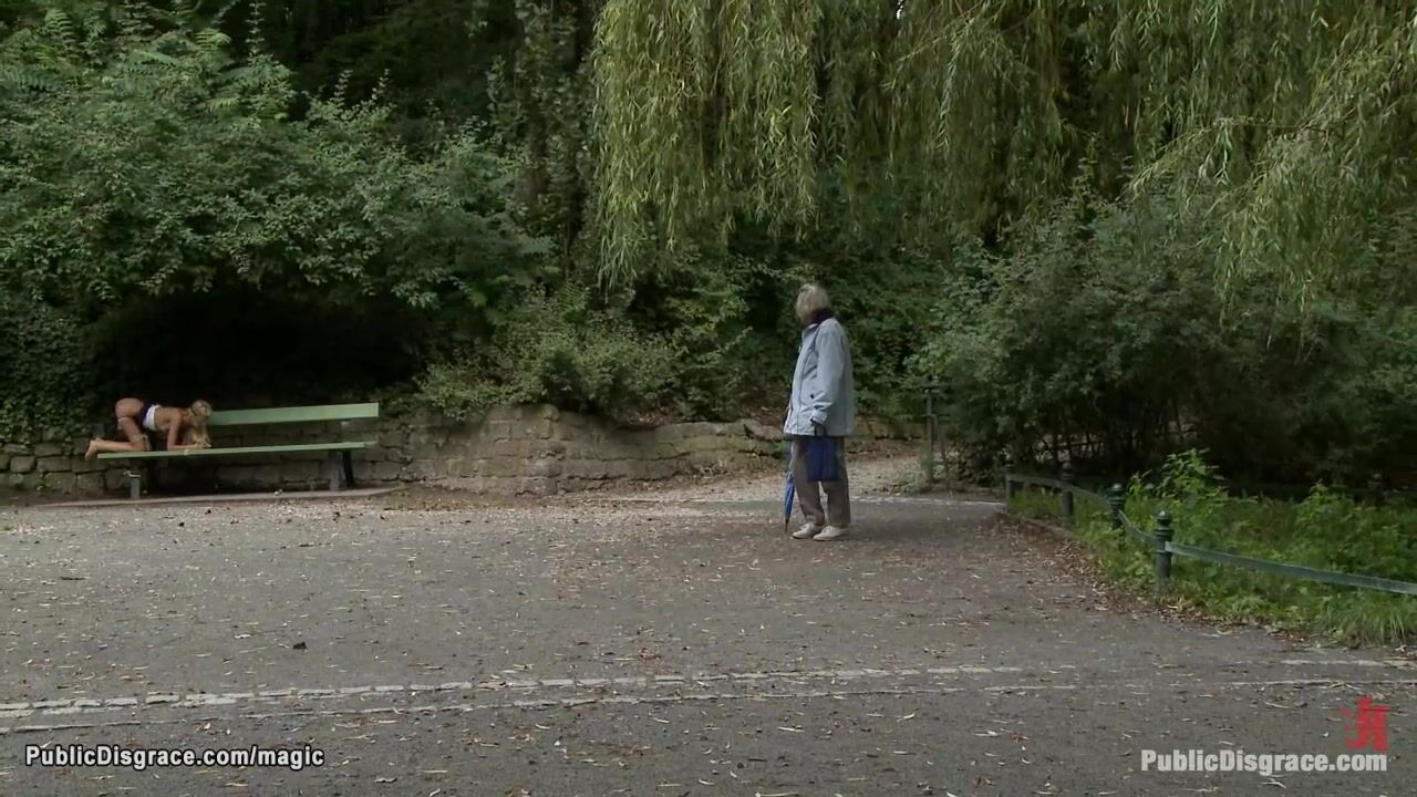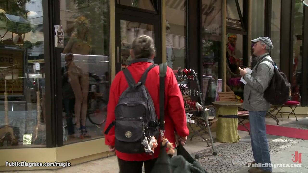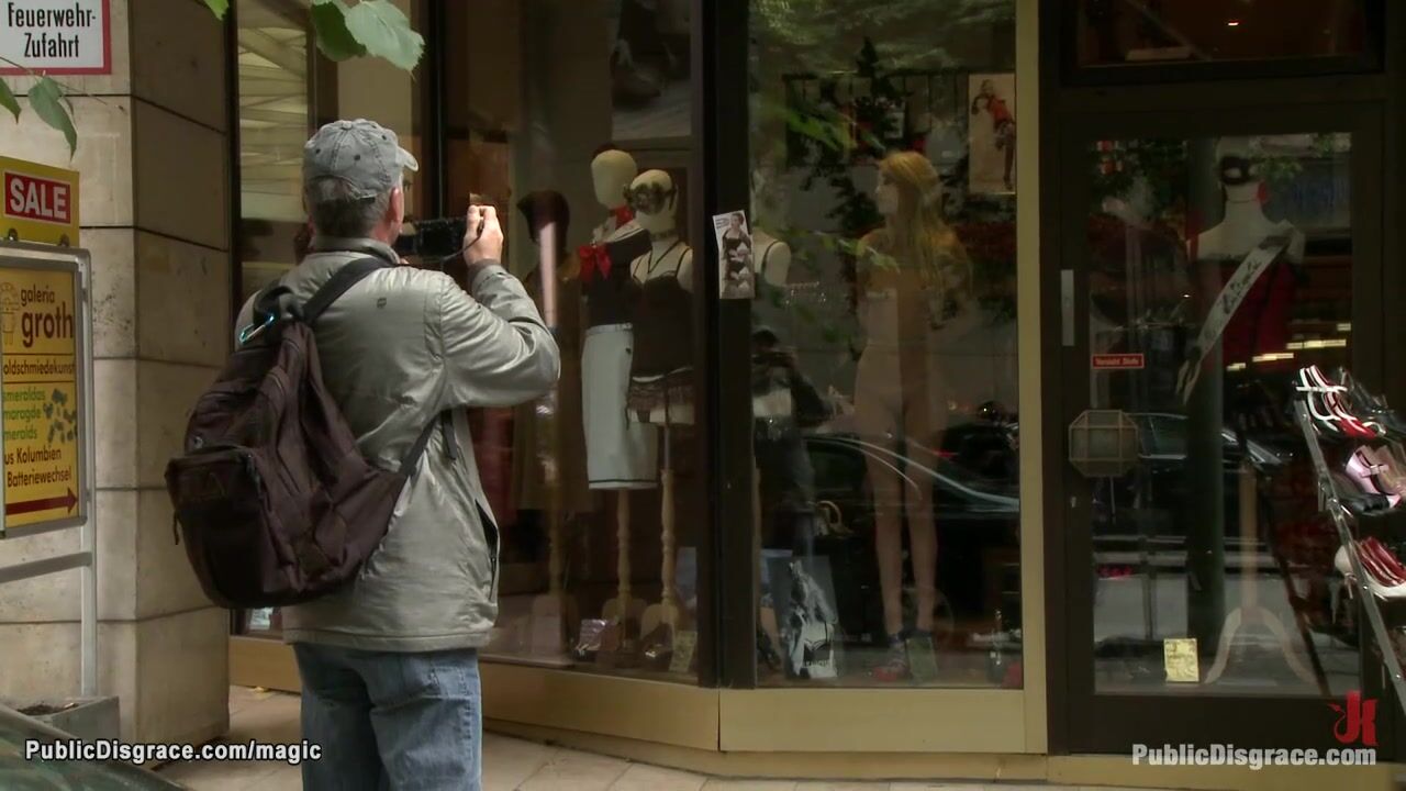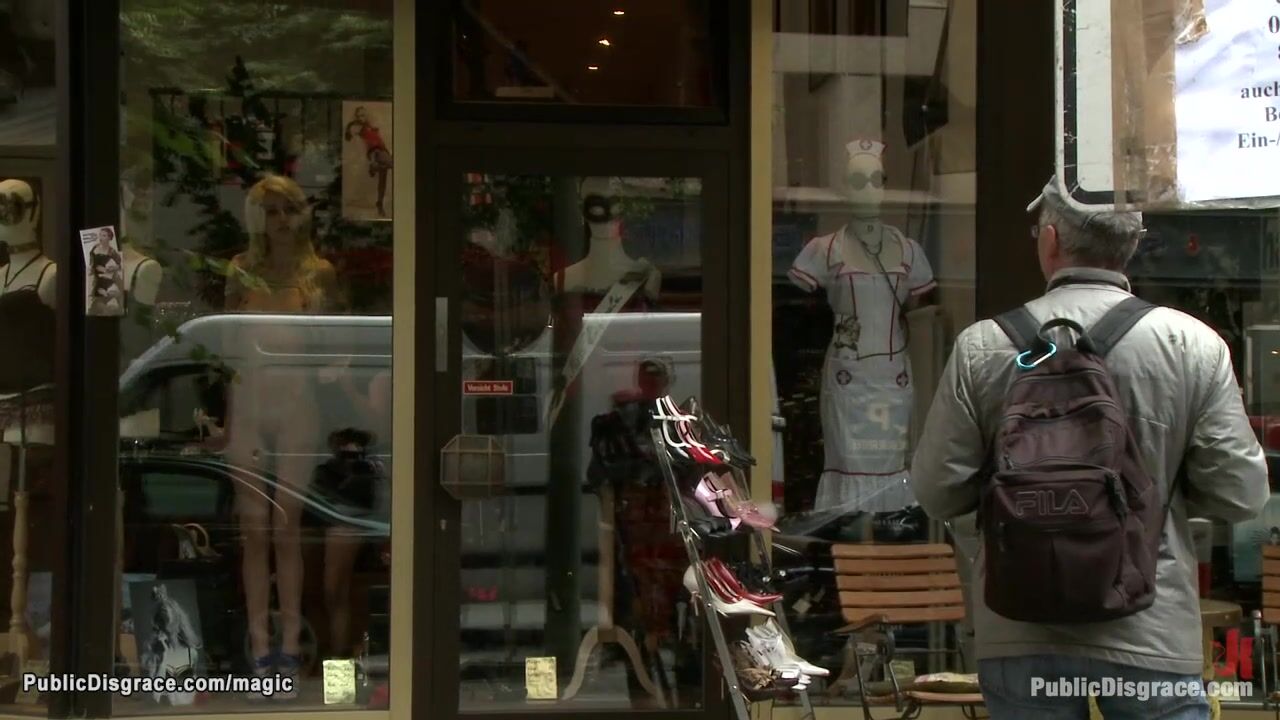 Description: Slim small tits blonde Euro babe Blanche posing naked in public shop window then dragged in park and big cock fucked by Zenza Raggi