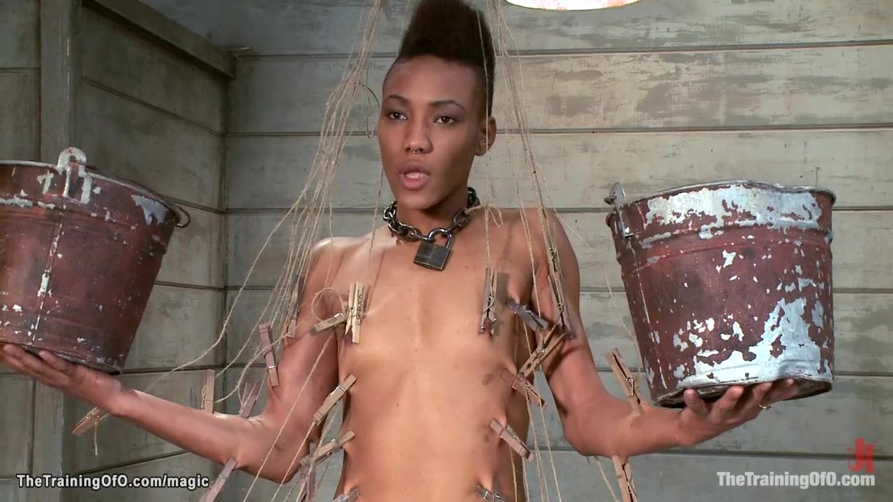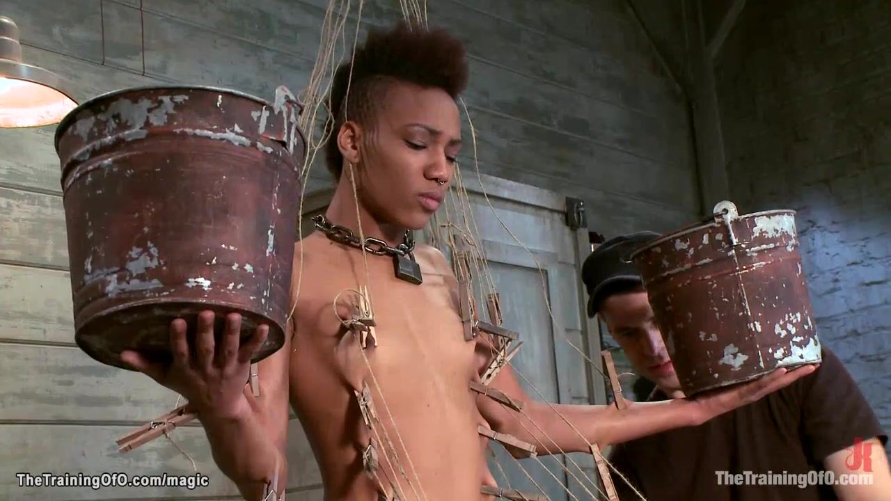 Description: Lean small tits ebony slave trainee Nikki Darling trained by master James Mogul and made hold heavy buckets and ride vibrator and get whip
