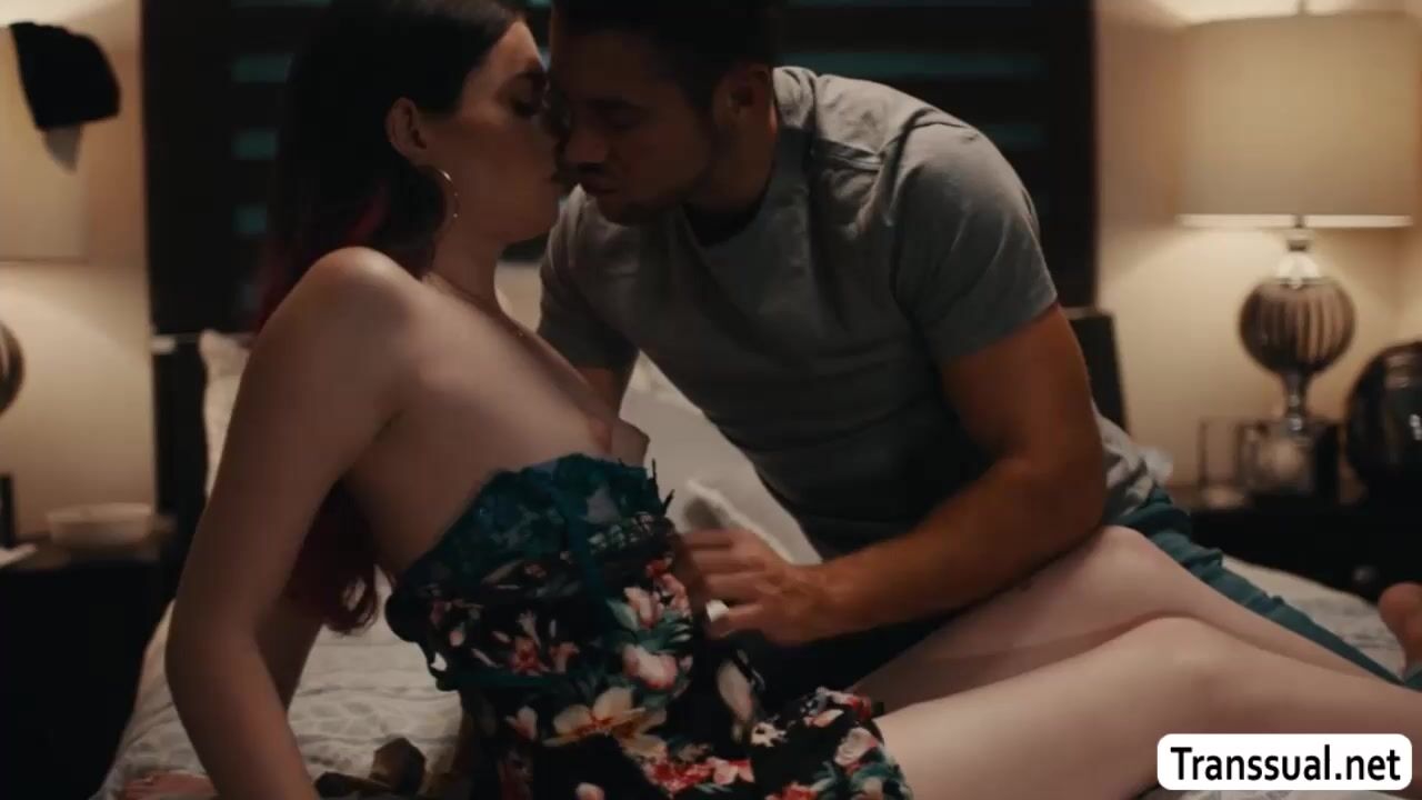 Cute shemale goes to the room of her stepbrother and talks about something.After that,they get horny and start kissing each other on the bed.Next is,she throats his hard big cock passionately and lets him bareback her wet tight ass so hard.