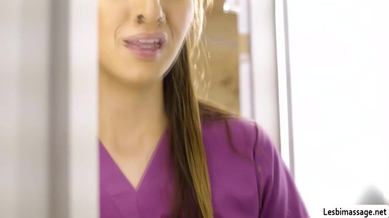 Brunette masseuse watches her co worker and her client kissing in the massage room.After that,she goes in and joins them.They start kissing in threesome way and next is,they get naked and lick their wet pussies passionately.