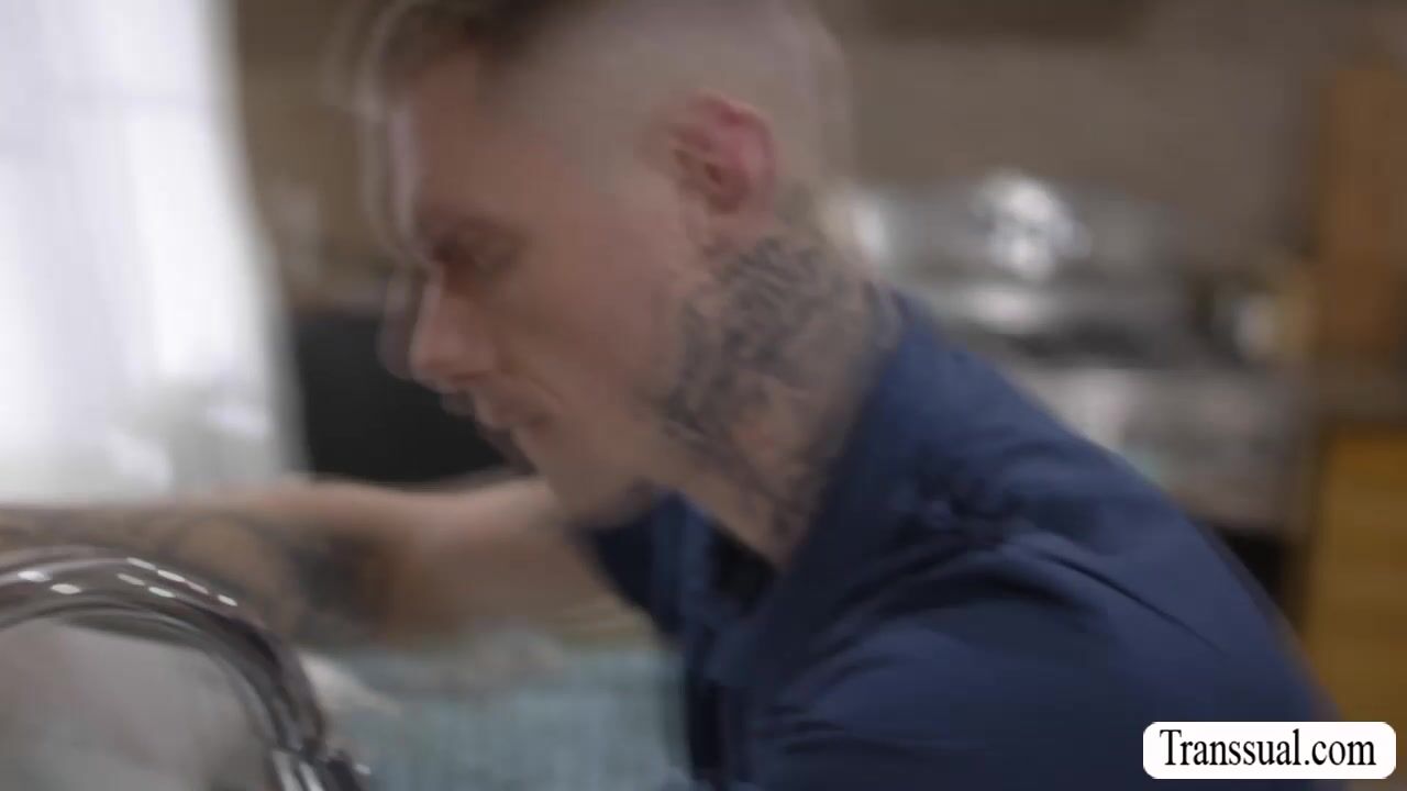 Horny blonde Tgirl licks the ass of the sink fixer while he is working.After that,she pulls out her shecock and she then barebacks his ass.Next is,she they move into the room and she then continue sucking his dick and barebacks his ass.