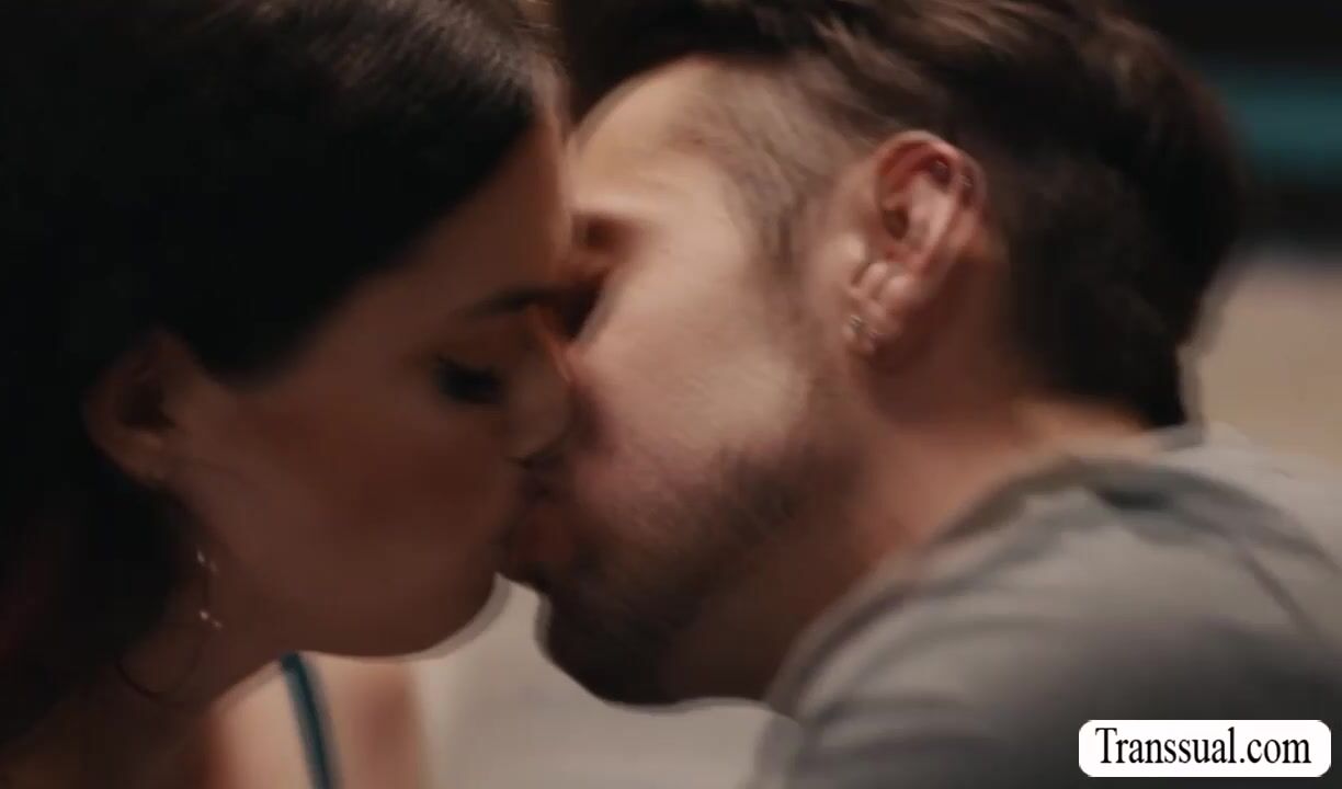 Slut shemale goes to the room of her stepbrother and talks about something.After that,they get horny and start kissing each other on the bed.Next is,she throats his hard big cock passionately and lets him bareback her wet tight ass so hard.