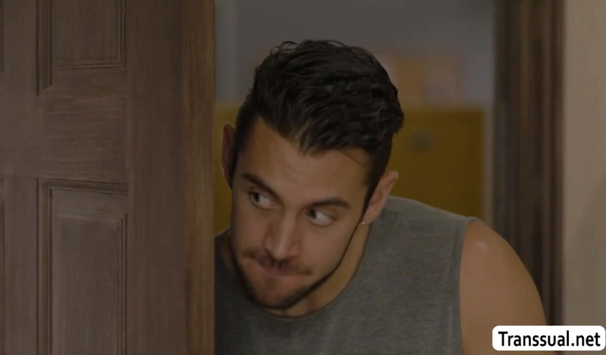 Horny dude take a peak while ebony shemale is getting naked in the locker room.After that,he watch TS ebony taking a shower and he lets her throat his hard big cock passionately.In return,he bareback fucks her tight big ass so deep and hard.