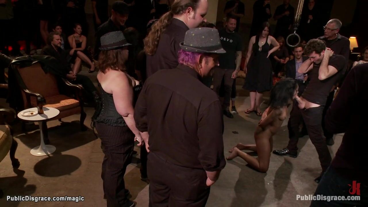Description: Petite ebony slave Skin Diamond is bound on the floor and zippered and groped then fucked with dildo and huge dick in crowded public place
