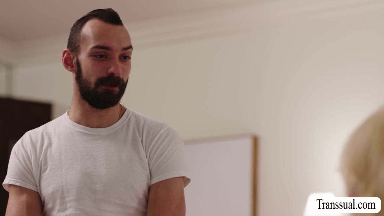 Shemale blonde wants to order new bed for her master bed room.After that,she gets horny and starts kissing the delivery guy and she then throats his hard big cock passionately.Next is,she bareback fucks his tight ass so deep and hard.