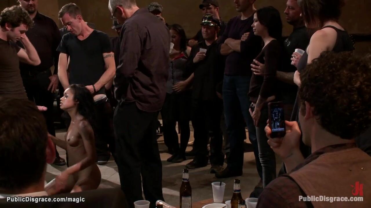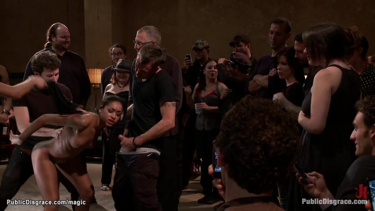 Description: Little ebony slave Skin Diamond zippered in public on the ground then groped and gang bang fucked with big cock and strap on in ffm