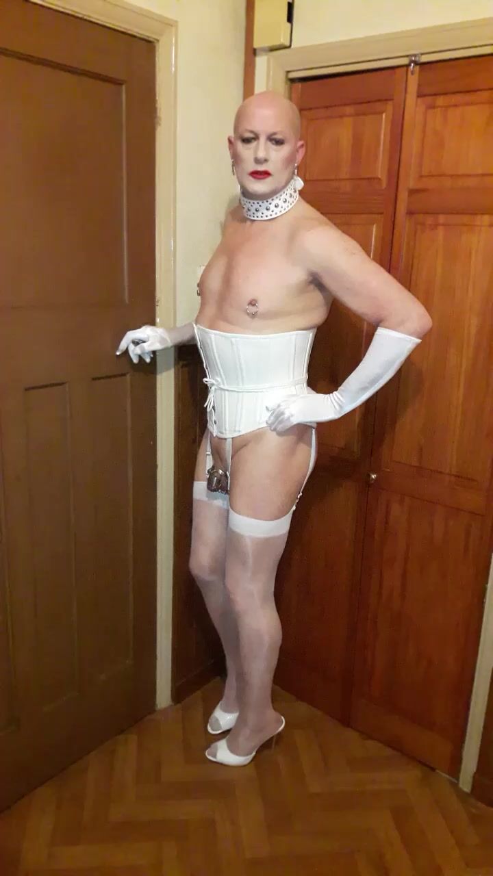 Description: ME DRESSED IN WHITE LINGERIE, STOCKINGS AND HEELS EXPOSING MYSELF AS A SISSY FAGGOT