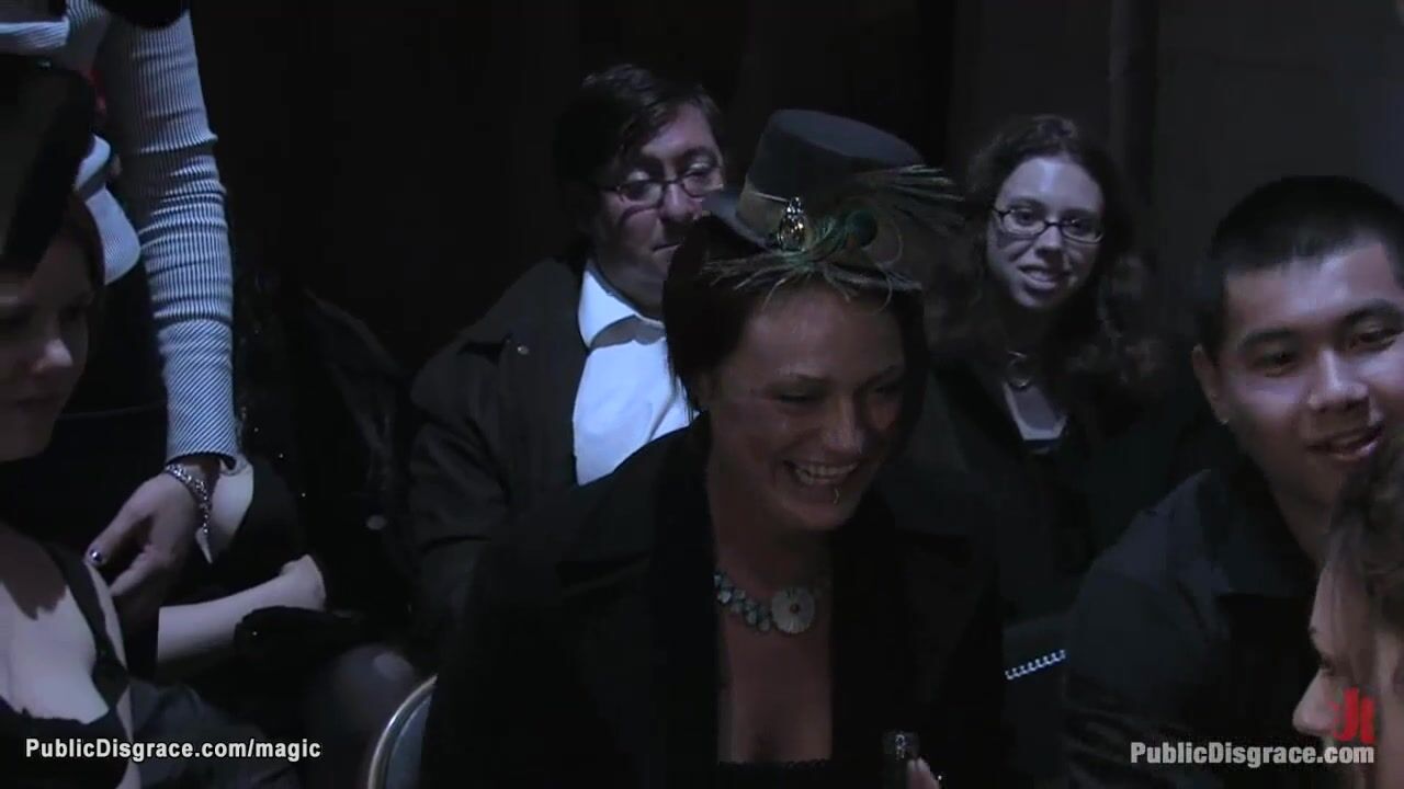Description: Bound slave Sarah Shevon holding plate with glasses while group od strangers groping her then strapped legs and spreaded caned in public place