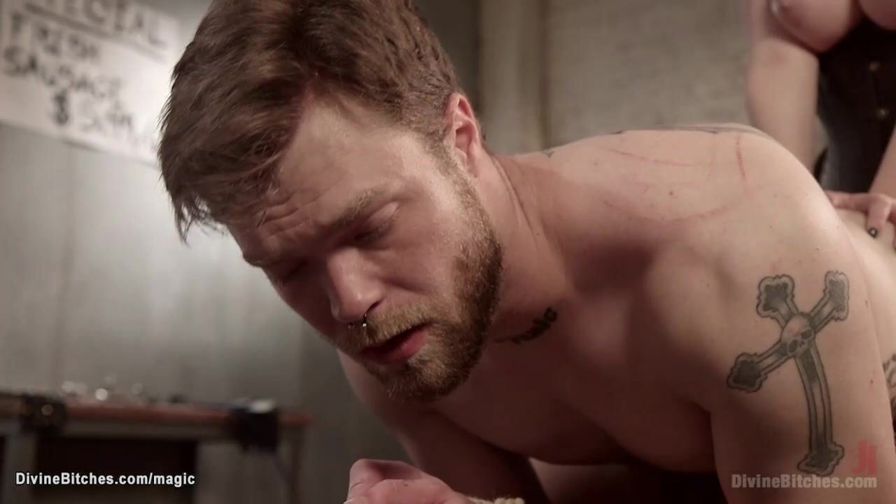 Description: Big tits blonde MILF butcher Aiden Starr straps down on knees delivery man Mike Panic and clamps his nipples then in doggy position anal fucks him with strap on cock