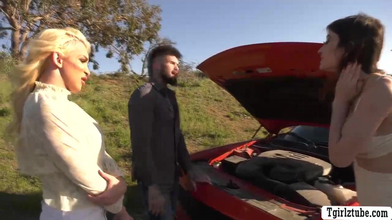 Two gorgeous shemales got rescue by stranger because their car didnt start.They bring him into their place and then they start kissing him and throat his hard big cock passionately.Next is,they bareback each others ass on the couch.