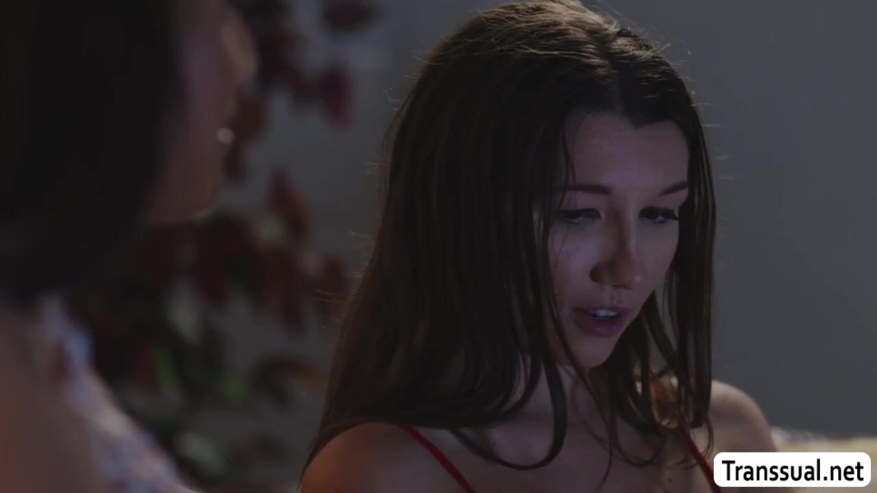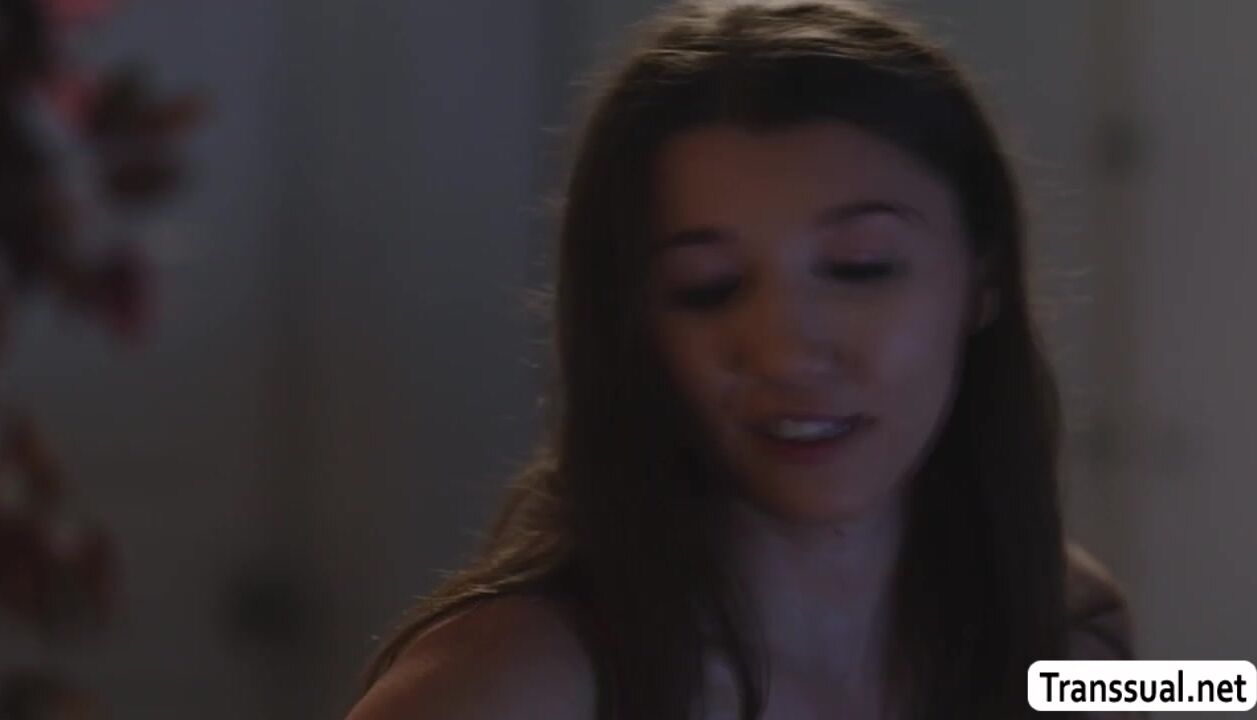 Pretty shemale joins her hot stepdaughter watching movies.After that,they get horny and start kissing each other.Next is,she lets her stepdaughter suck her tranny hard cock passionately.In return,she licks and bangs her tight pussy so deep and hard.