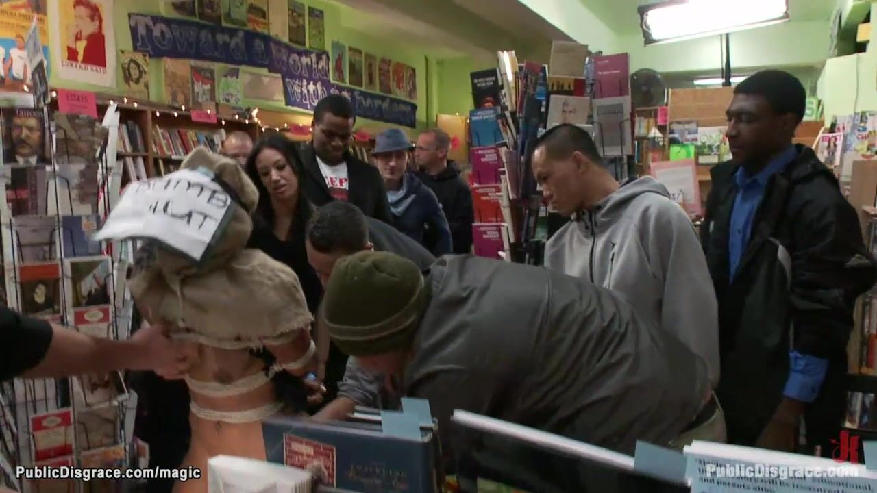 Description: Dom Princess Donna Dolore drags bound ebony babe Leilani Leeanne in crowded public book shop and makes her anal fuck with strangers