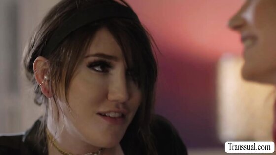 TS brunette and her pink haired stepsister are on the bed talking.After that,they get horny and start kissing and sucking their nipples passionately.Next is,she lets her stepsis throat her tranny cock before she fucks her tight wet pussy so hard.