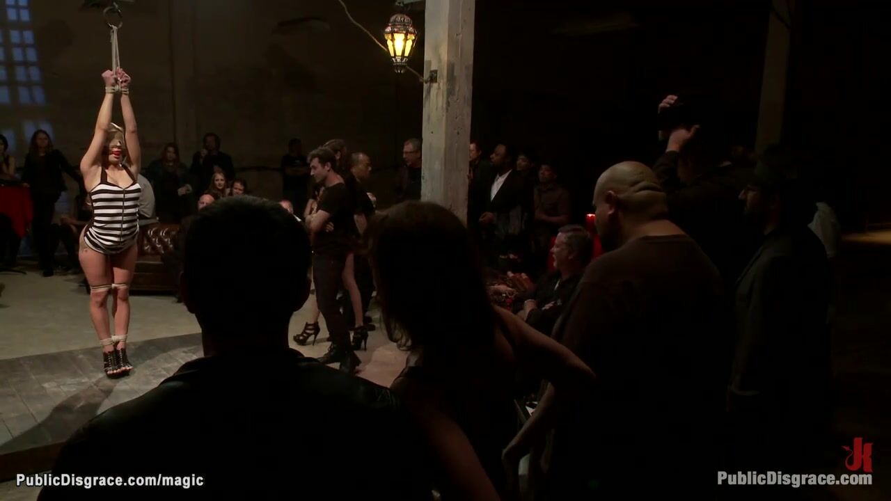 Bound and blindfolded and gagged beauty Amy Brooke gets spanked and groped in public then throat fucked and cattle prodded by Princess Donna Dolore and James Deen