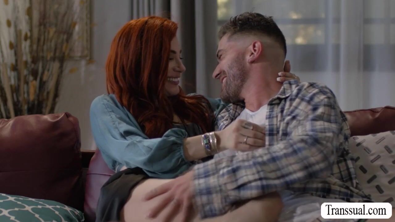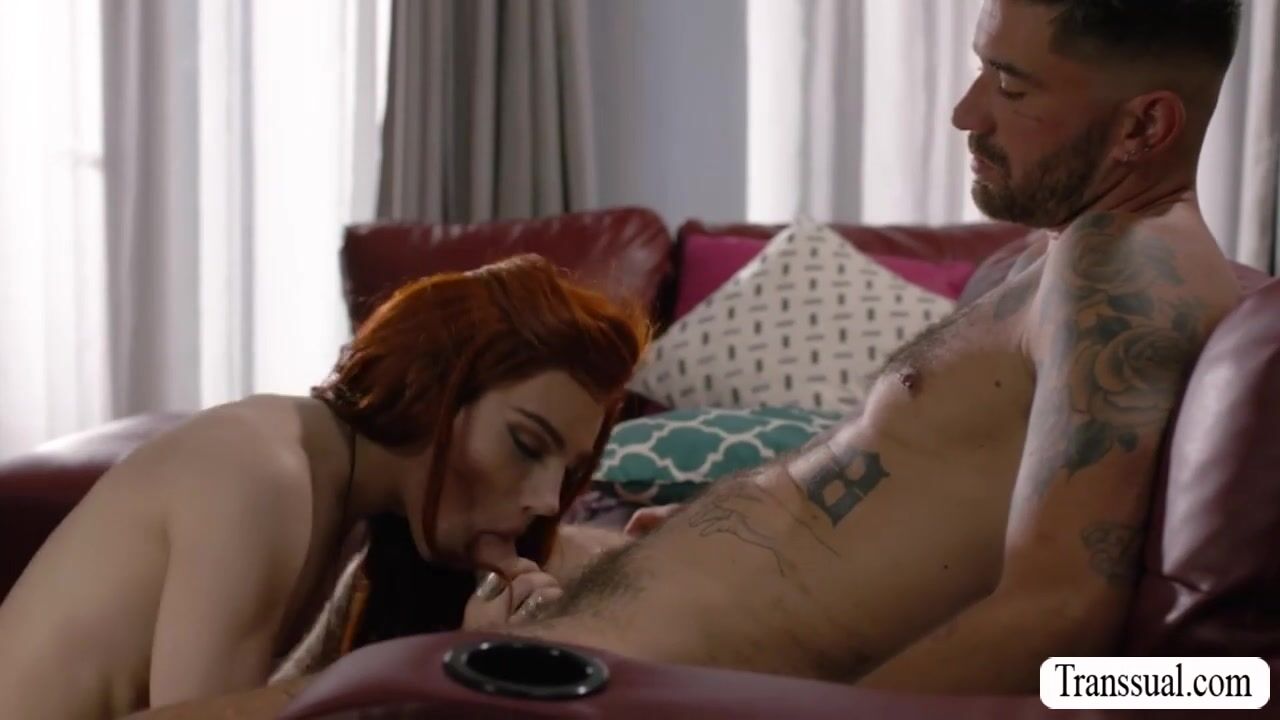 Redhead TS brings her boyfriend into her place while her husband is out for good.They start kissing each other on the couch and she then throats the hard big cock of her boyfriend.In return,the guy bareback fucks her tight wet ass so deep and hard.
