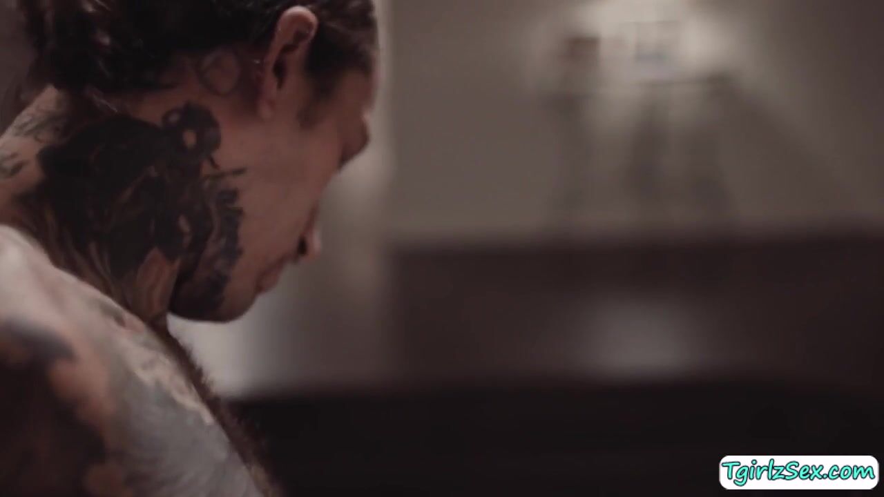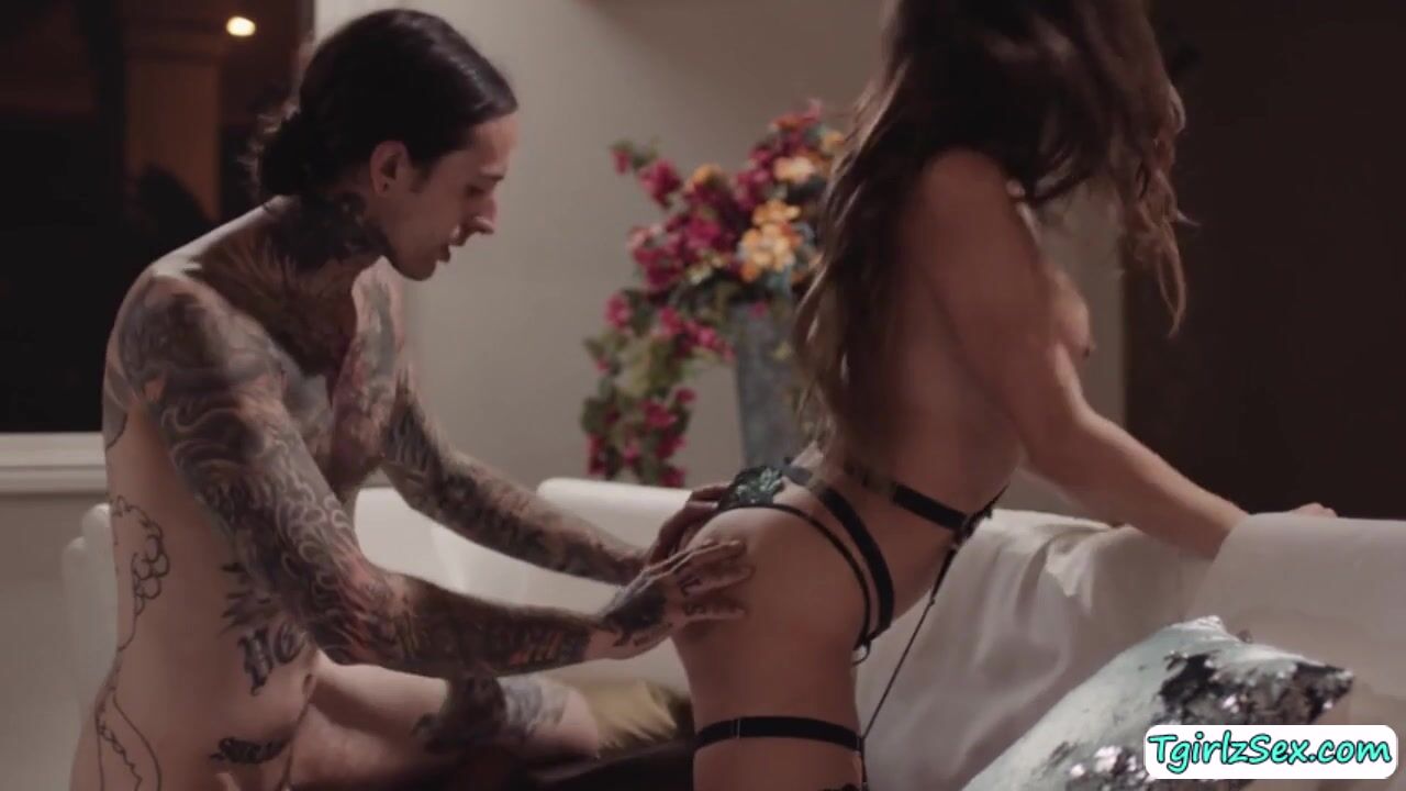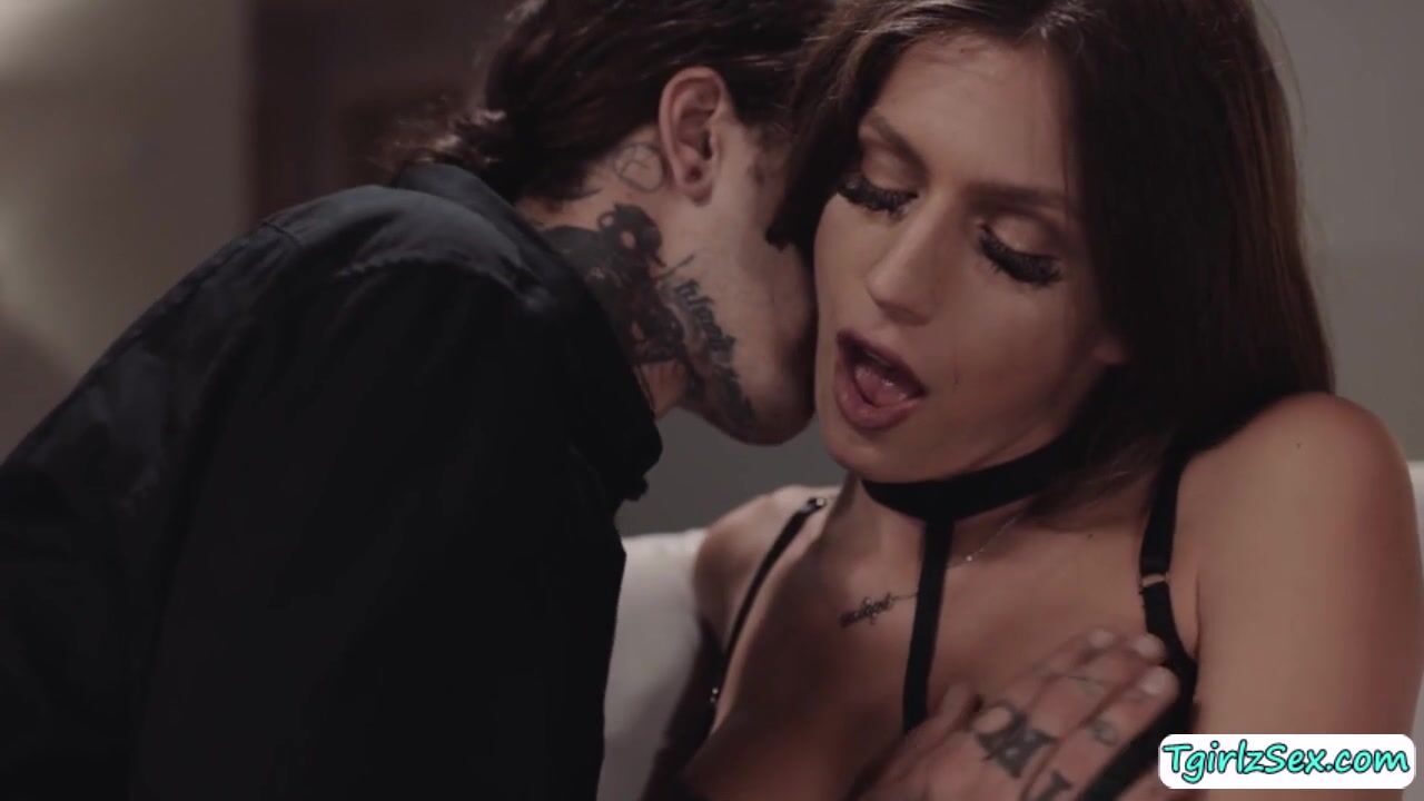 Description: Hunk tattoed guy Ruckes Jade welcomes big tits brunette transexual Jade Venus with open arms in the couch. Their hands reaches for both their big cocks rubbing while kissing tenderly before they take turn to deepthroat blowjob before he anal barebacks.