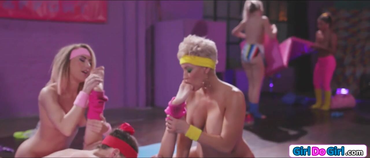 Petite blonde gets dominated by lesbian fitness babes.The small tits cutie gets undressed and is licked by the busty instructor while the group watches.The big tits babe makes her eat her snatch.Then the big boobs milf facesits her while giving oral