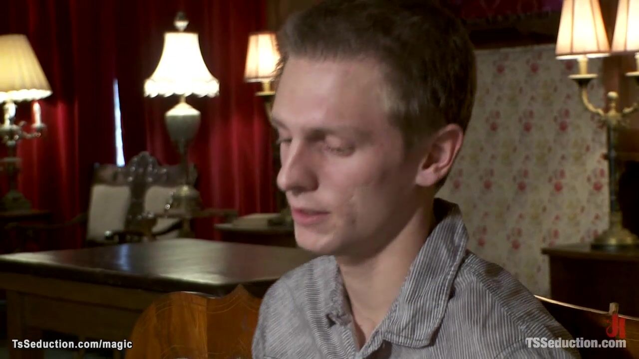Description: Piano teacher Johnny is seduced by brunette shemale student Honey Foxxx and gets blowjob then she binds him and anal fucked with big cock balls deep on the sofa