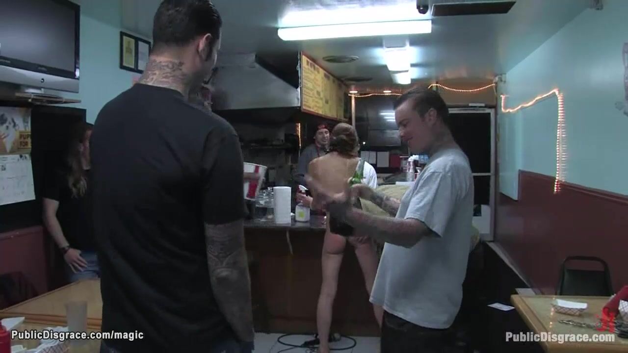Description: Skinny brunette slut Delilah Knight is anal fisted on counter then gang bang fucked by big cocks of master Mark Davis and strangers in public restaurant