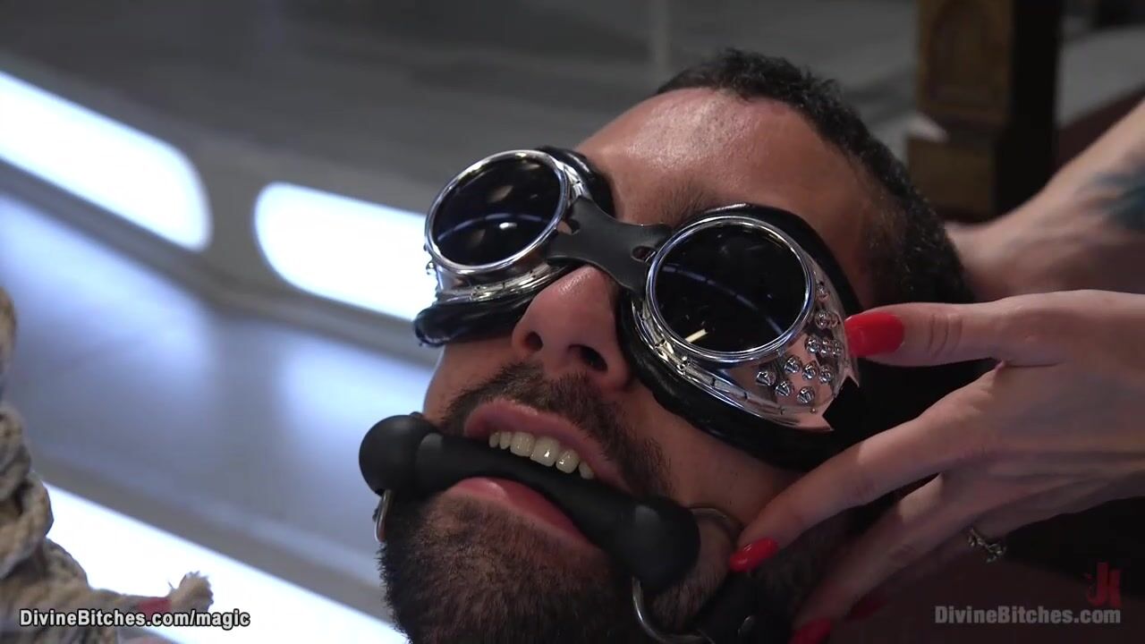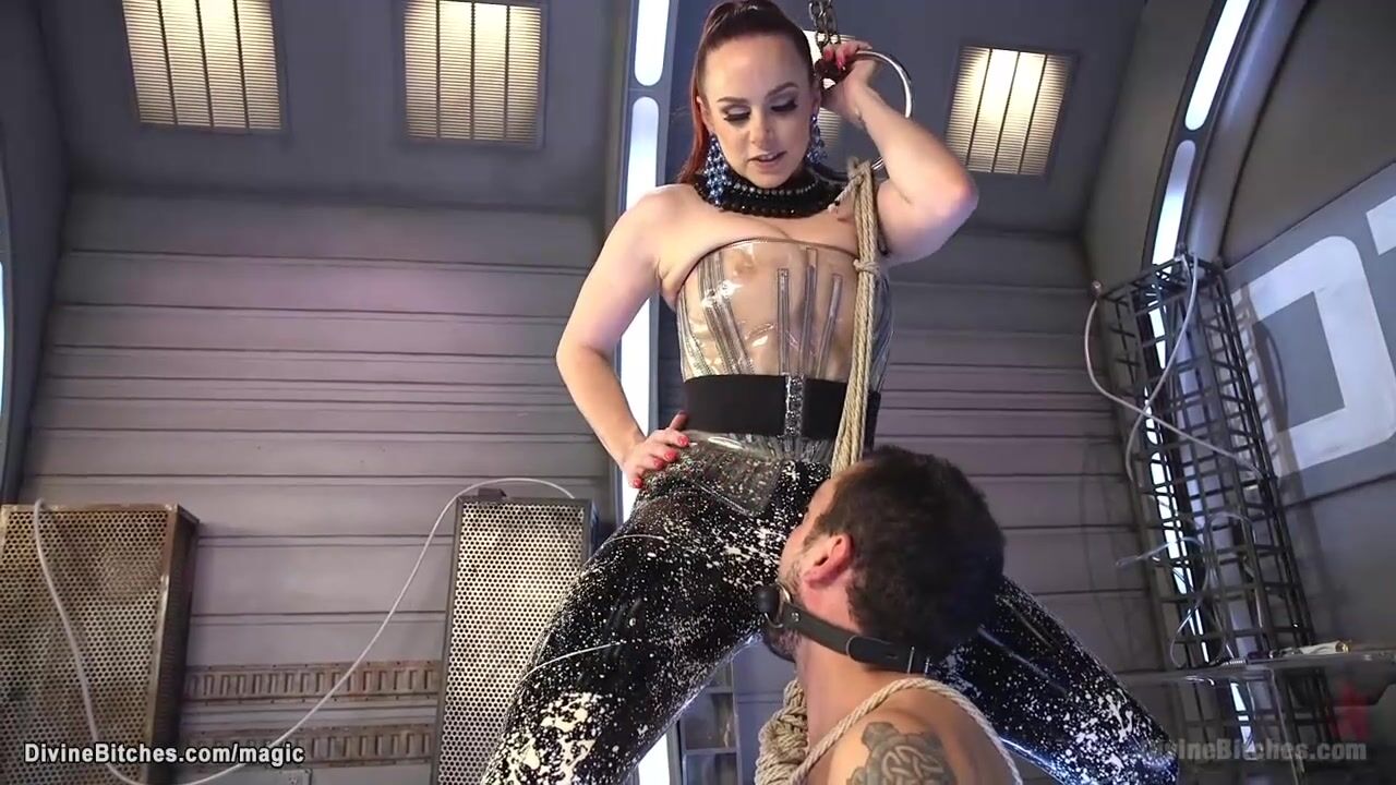 Description: Red head mistress in latex Bella Rossi binds and teases her submissive DJ and makes him sniff her pussy then pegs him in doggy style position from behind then rides his big cock