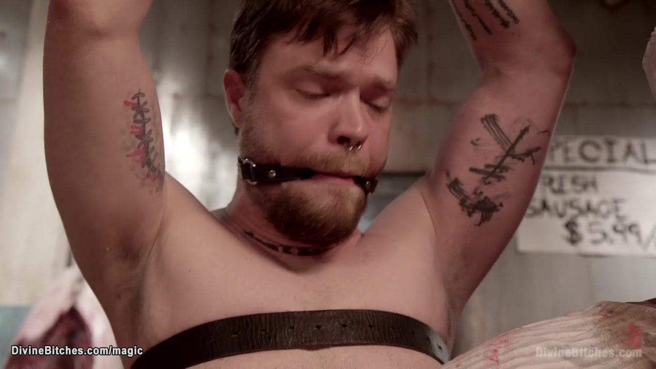 Description: Meat delivery man Mike Panic is gagged and strapped down on his knees on the ground and hard caned by huge boobs blonde MILF butcher Aiden Starr then throatfucked with strap on dick