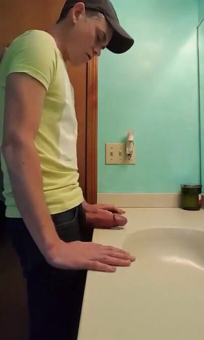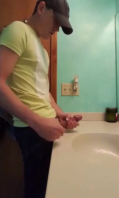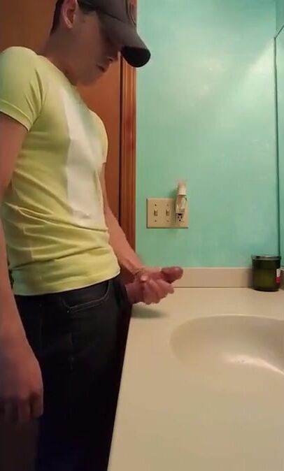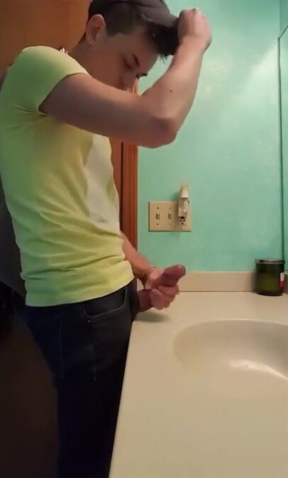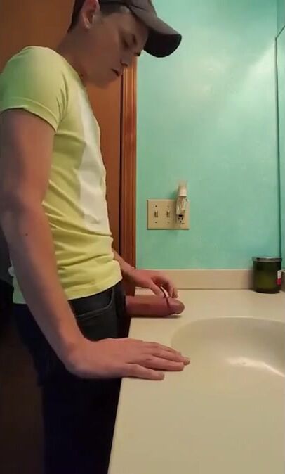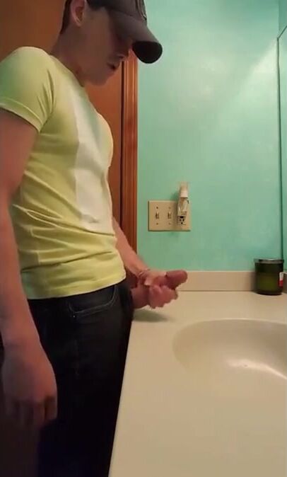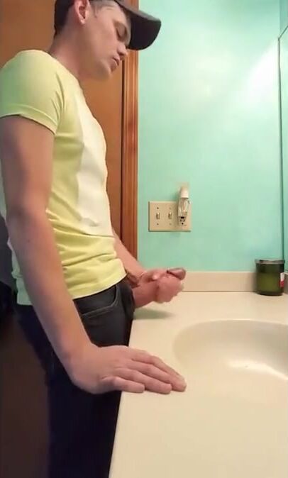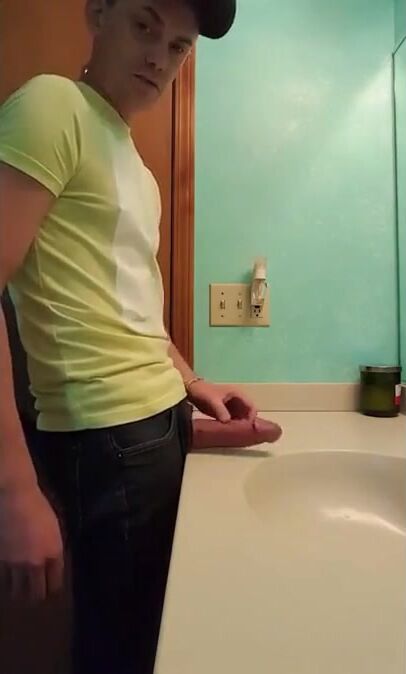 Description: a straight guy jerks off in bathroom with fat dick