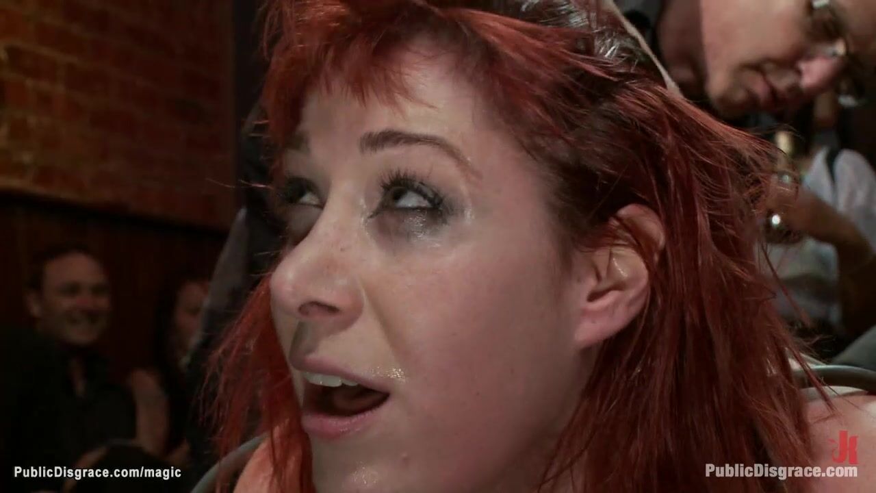 Description: Red head slave Odile is bound in doggy style cage and pussy fingered then throat banged till anal fucked by big dick Mark Davis in crowded public bar full of strangers