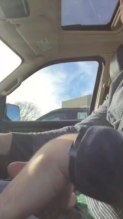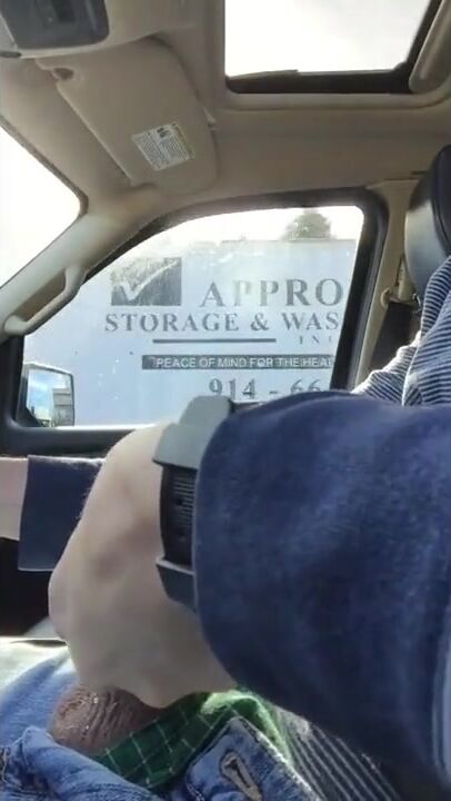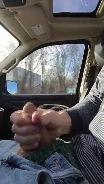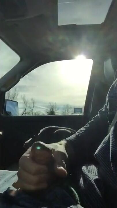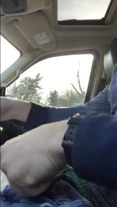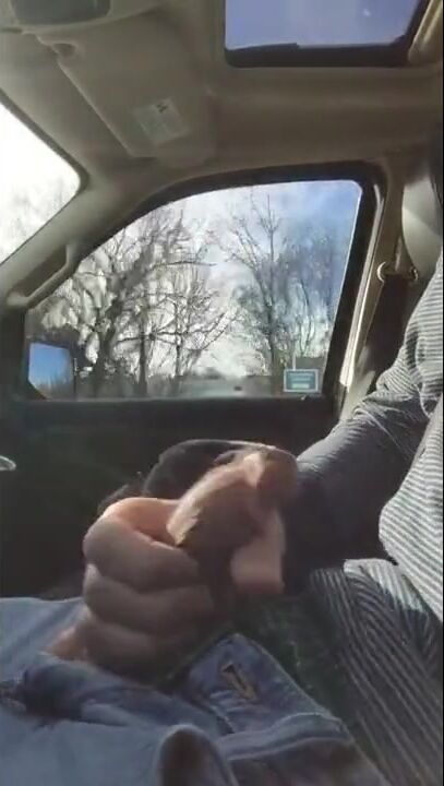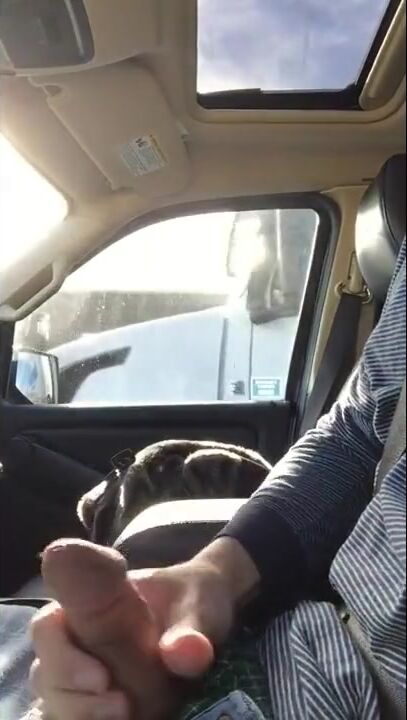 Description: Jerking off and cumming while driving on highway. Pass several trucks and a tour bus full of people.
