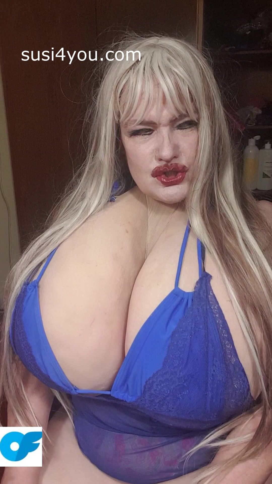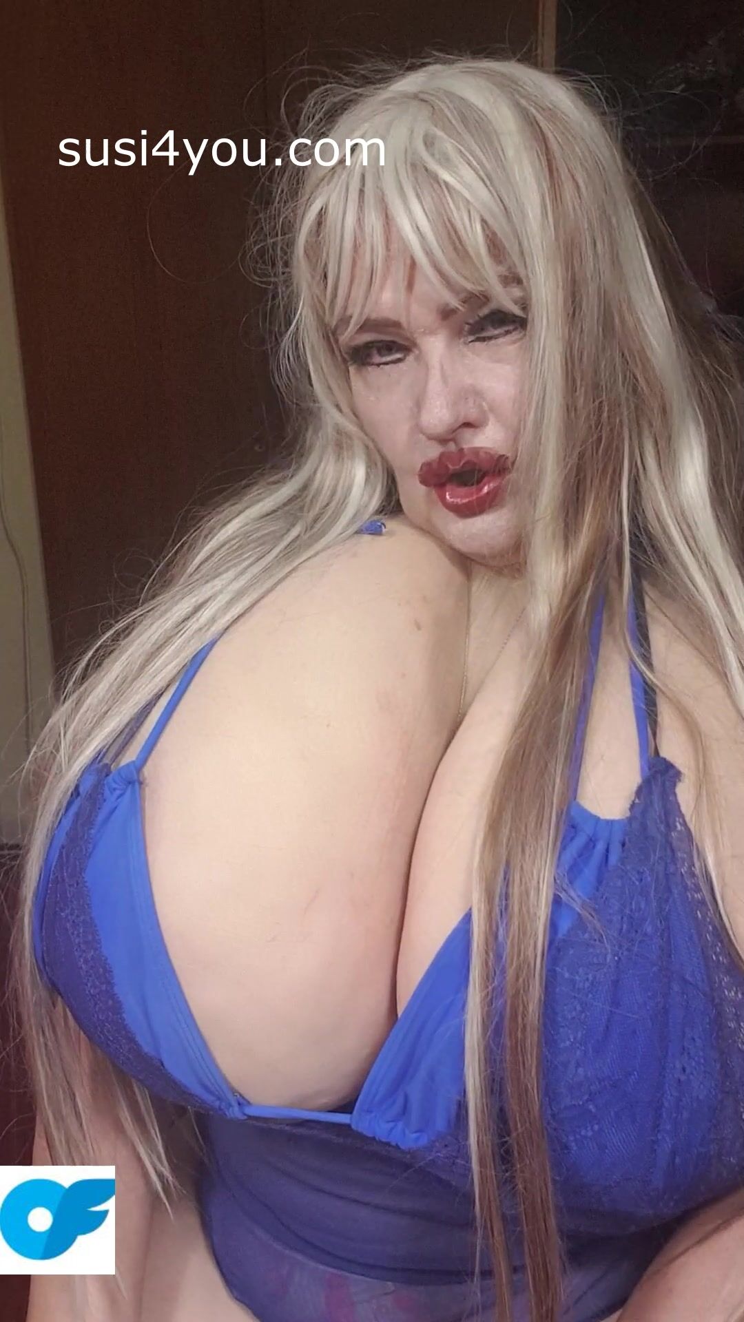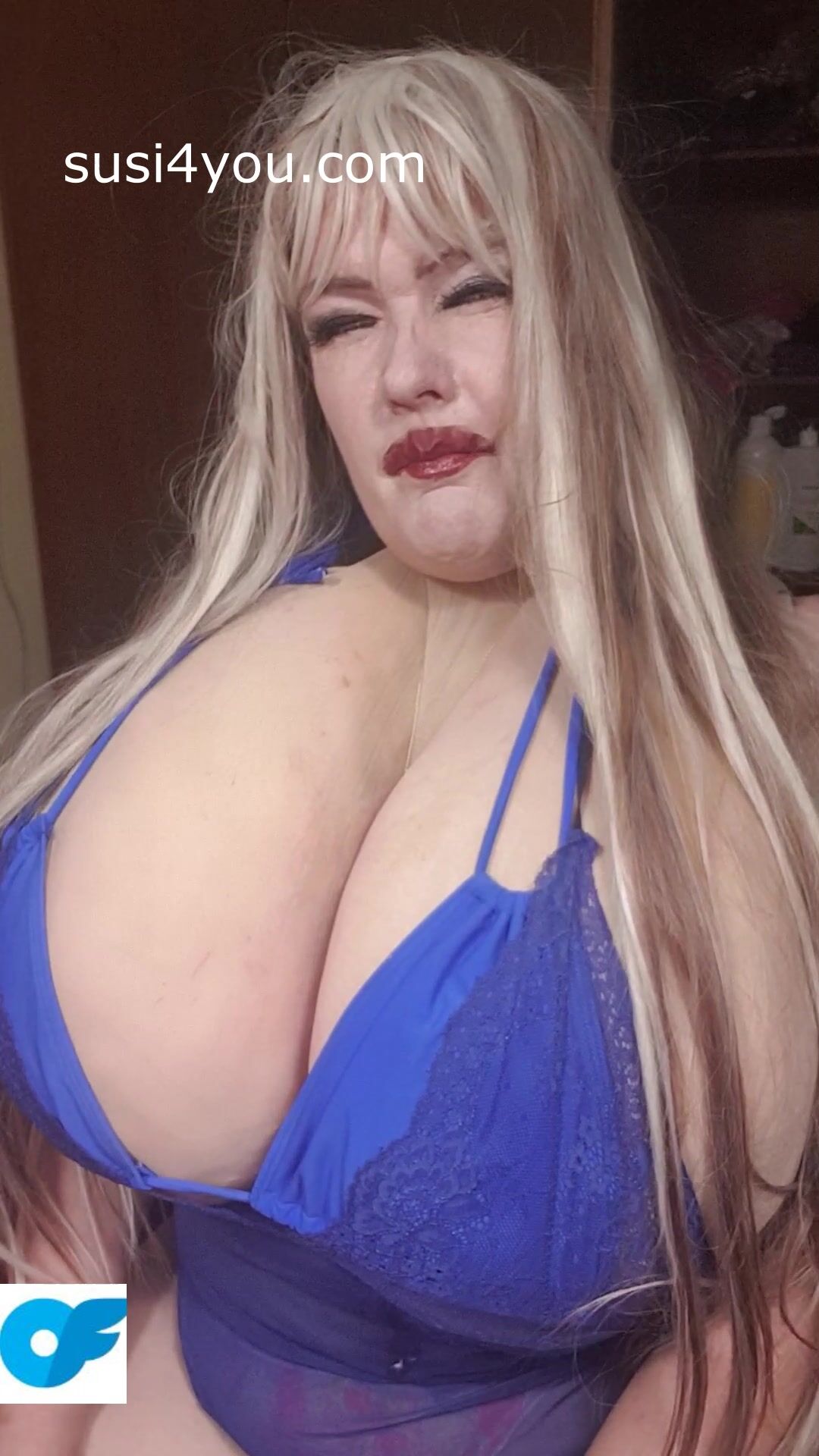 Susi is wearing lingerie in blu. She sucks toy. Watch her moaning and enjoying cocktoy till it comes so much cum in mouth She is moaning having fun Come with her She is pulling down her underwear showing fat cup k tits cum on them hun.