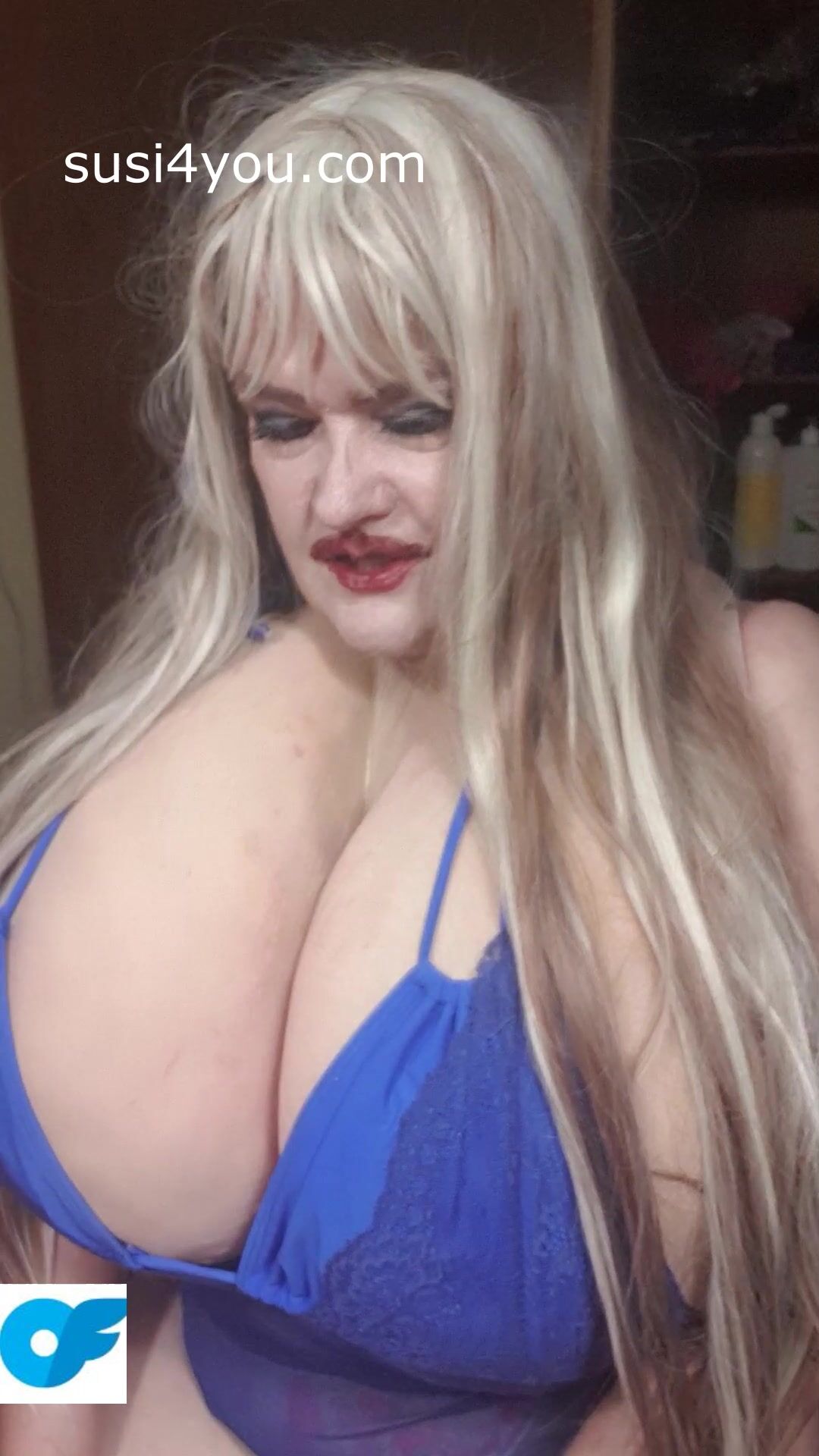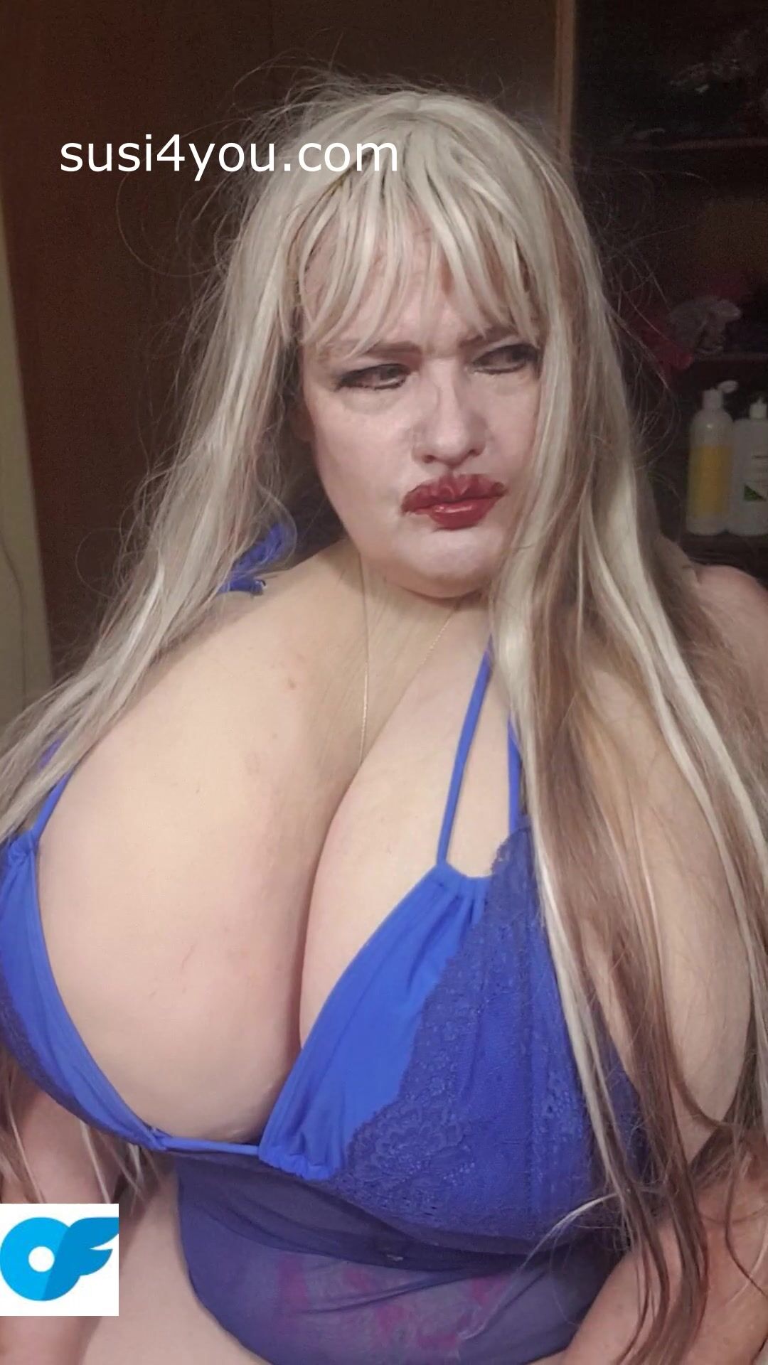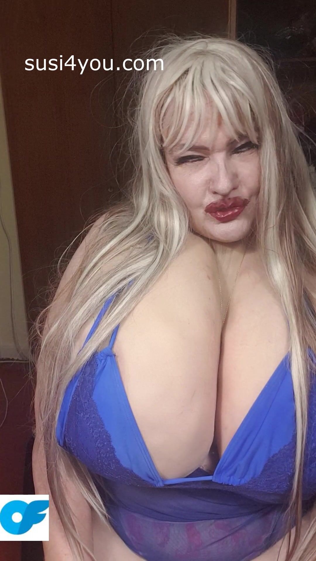 Susi is wearing lingerie in blu. She sucks toy. Watch her moaning and enjoying cocktoy till it comes so much cum in mouth She is moaning having fun Come with her She is pulling down her underwear showing fat cup k tits cum on them hun.