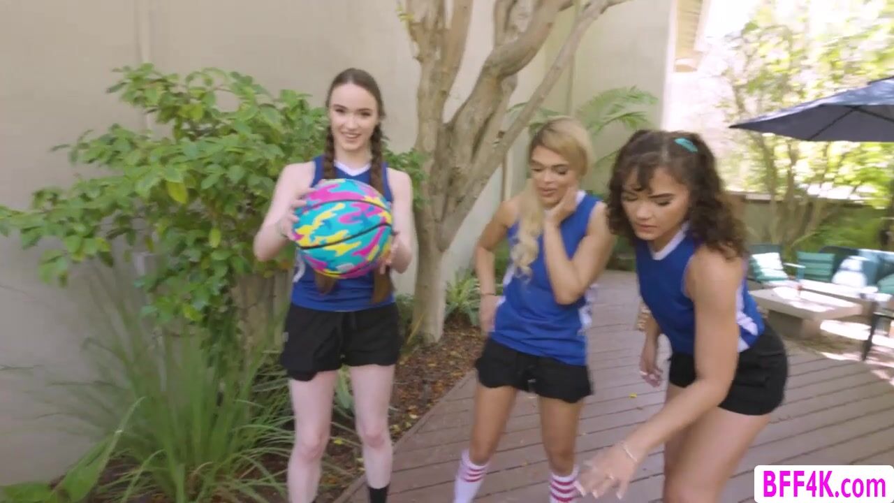 Three teen basketball players are practicing their dribbling skills with their coach.After that,they show their tits to their coach and invite him to have sex.They start sucking his big cock and he fucks their wet pussies one by one.