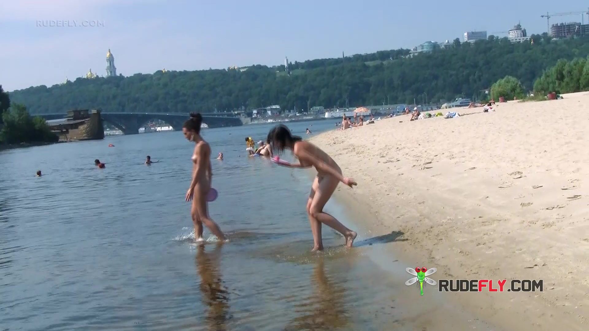 Bombastic young nudist babes sunbathe nude at the beach Video