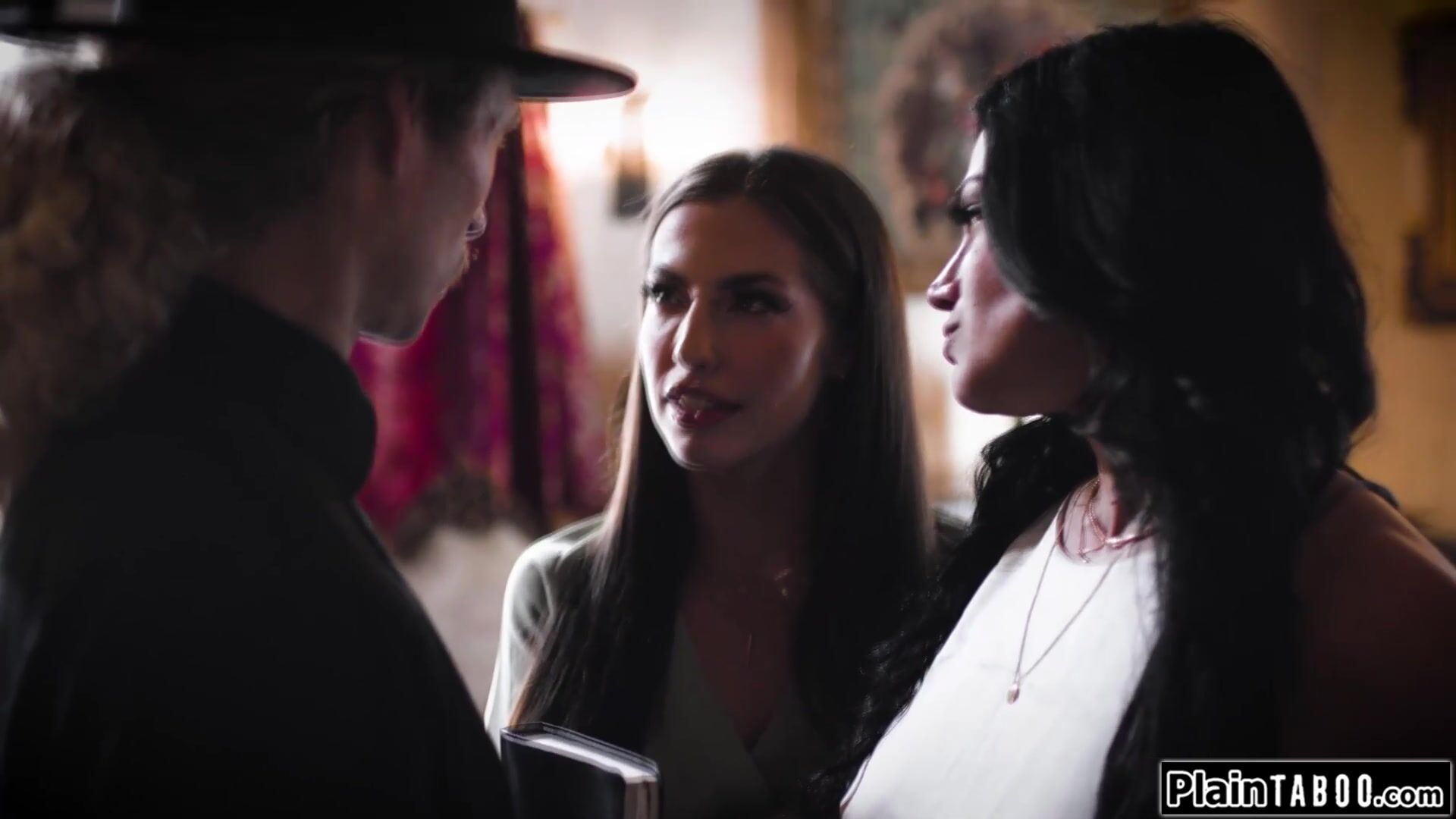 Description: Lesbian couple convert a disgusted priest by licking pussy ifo him while he jerks off.The small tits petite babe facesits him with her hairy pussy while her busty gf suck off his big cock.The brunette rides his dick and squirts out an orgasm