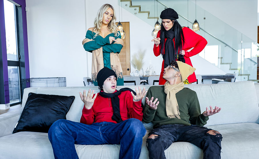 Description: Milf stepmoms Bunny Madison and Mona Azar are concerned about the well being of their stepsons, Diego and Ellias. The two babes comfort them with heated foursome sex in the couch together they blowjob their bigcocks before getting their pussies fucked.