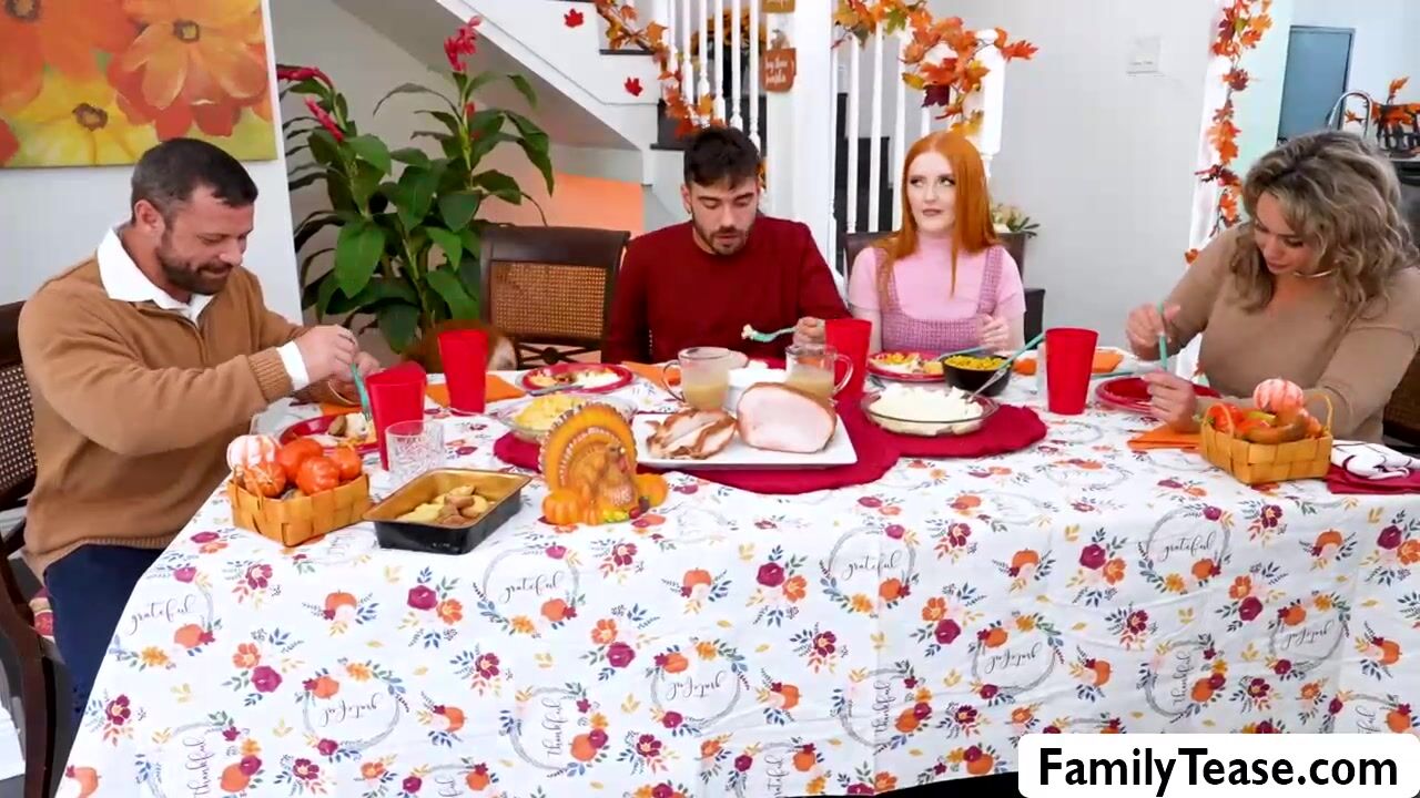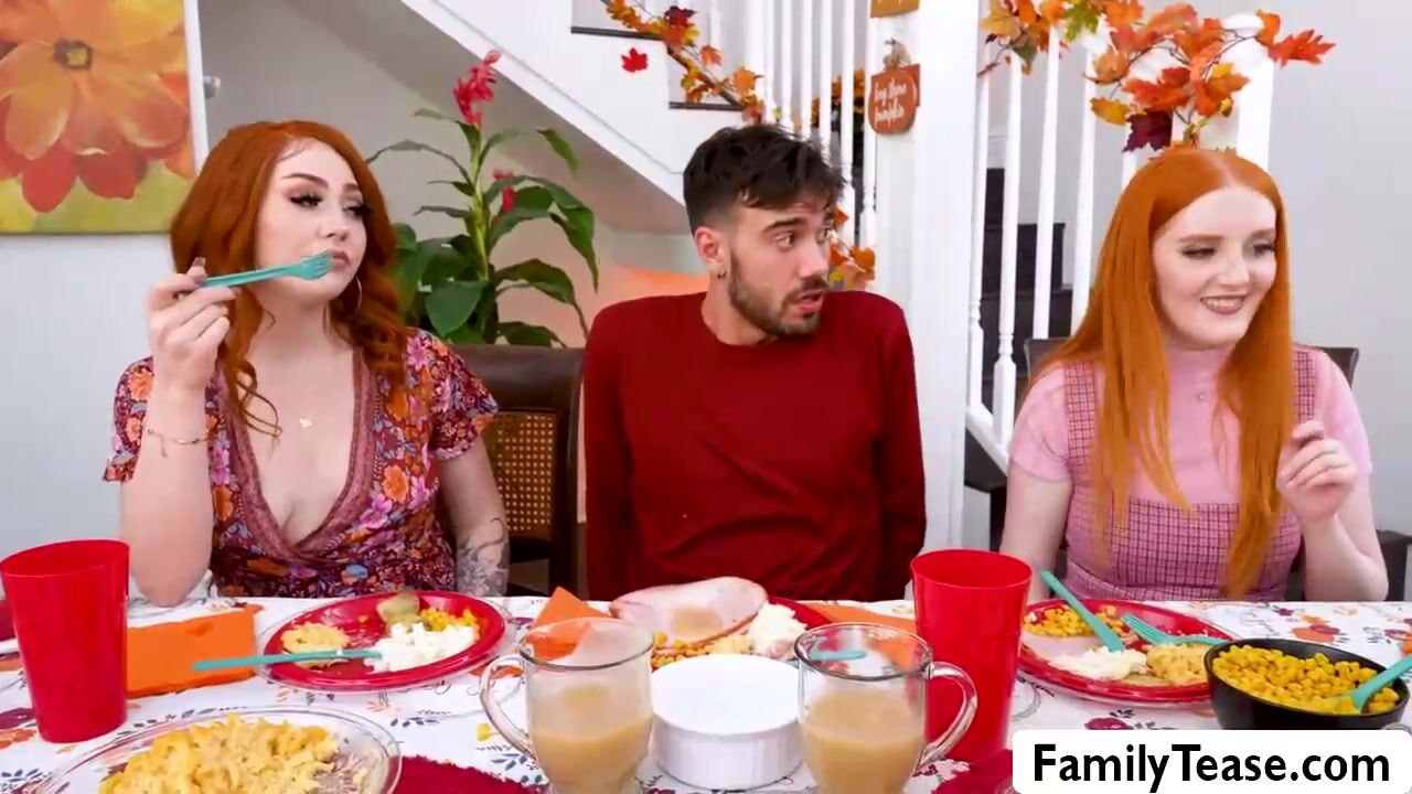 Redheads Arietta Adams and Cherry Fae invite their friend Nate to their house for Thanksgiving dinner pleasuring him by sucking his bigcock under the table. Soon, they moved in the couch where they enjoy shardcore threesome with pussies fucked multiple angles.