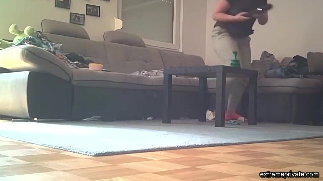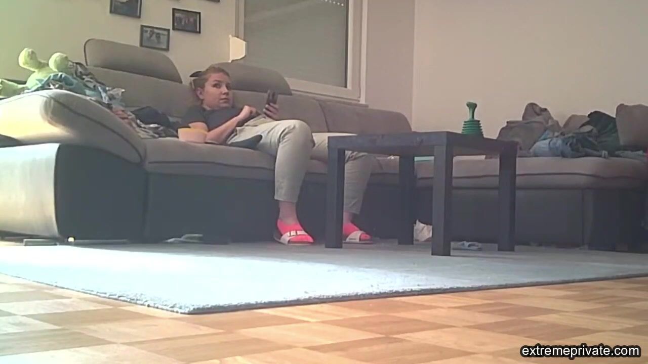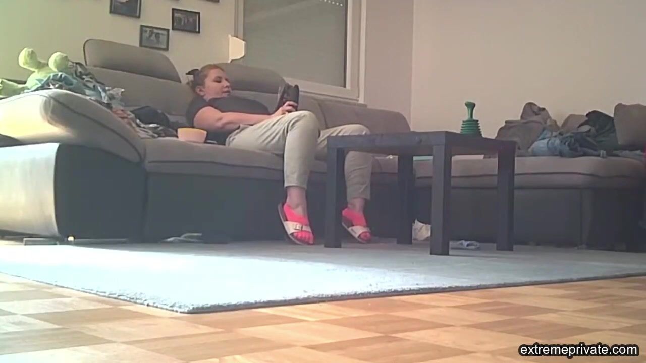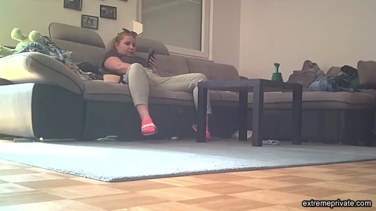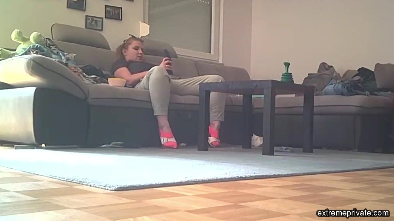 My chubby mom (Liverpool) on the couch on a weekday afternoon. Quick masturbation in her clothes. She looks at her phone. To porn or something from a friend, I don't know. She fingers without being aware of our camera in the living room.