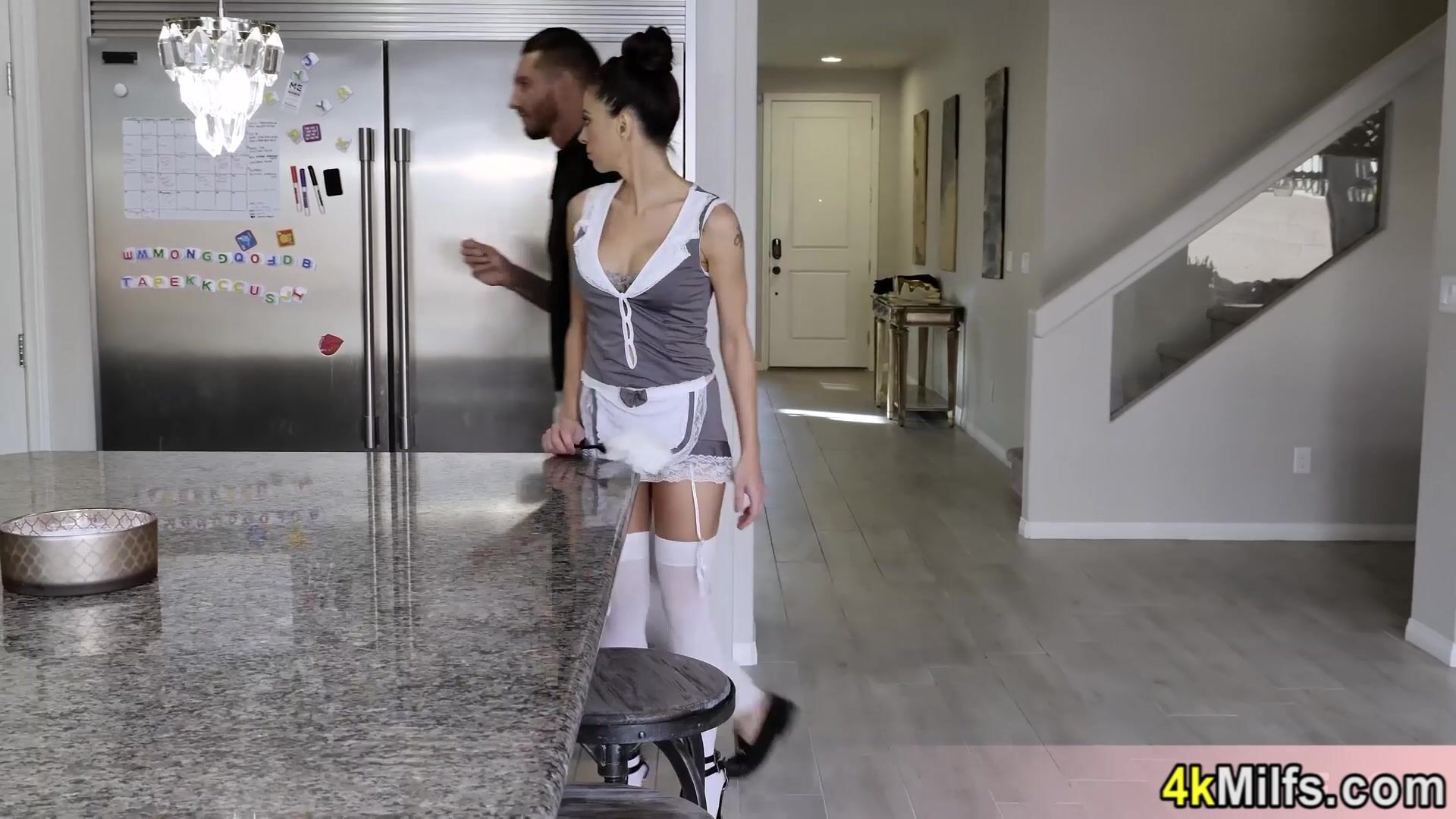 Description: Skinny brunette MILF maid Eva Long with big boobs is cleaning the house in sexy uniform Her horny landlord comes and orders the petite slut to wax his big cock After the blowjob he is fucking her pierced pussy hard