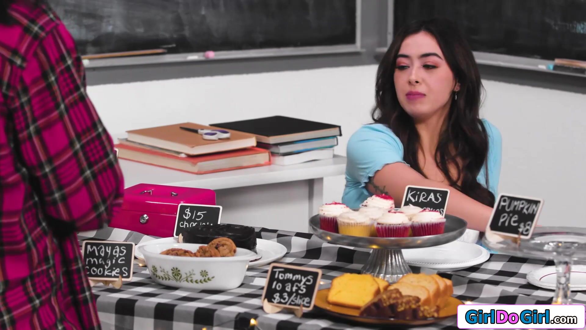 Busty stepmom licks stepdaughter under table during bakesale Video