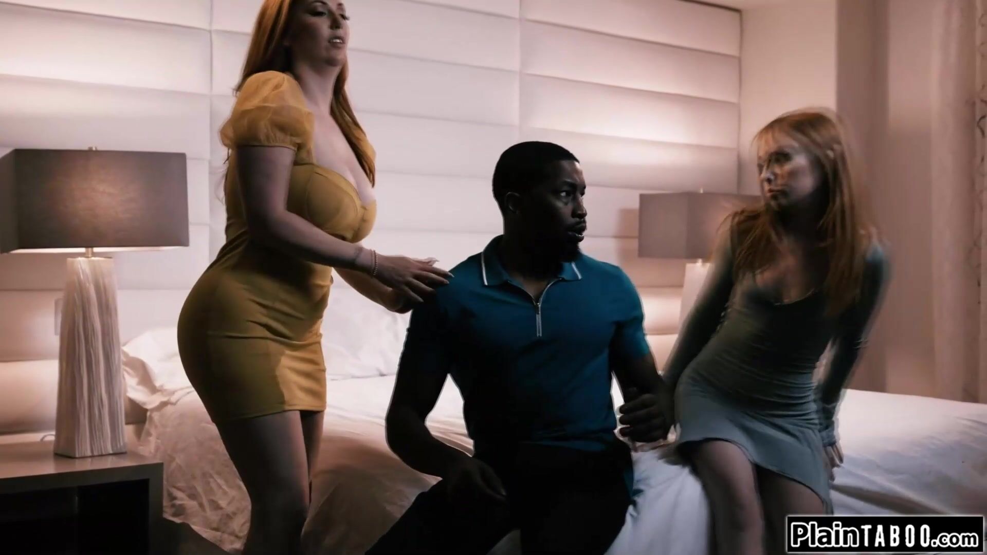 Black bf finds himself shared between his small tits gf and her horny busty redhead stepmom.The big boobs milf and her stepdaughter suck his big black cock.The cougar rides him with her hairy pussy and is licked while watching the babe get banged
