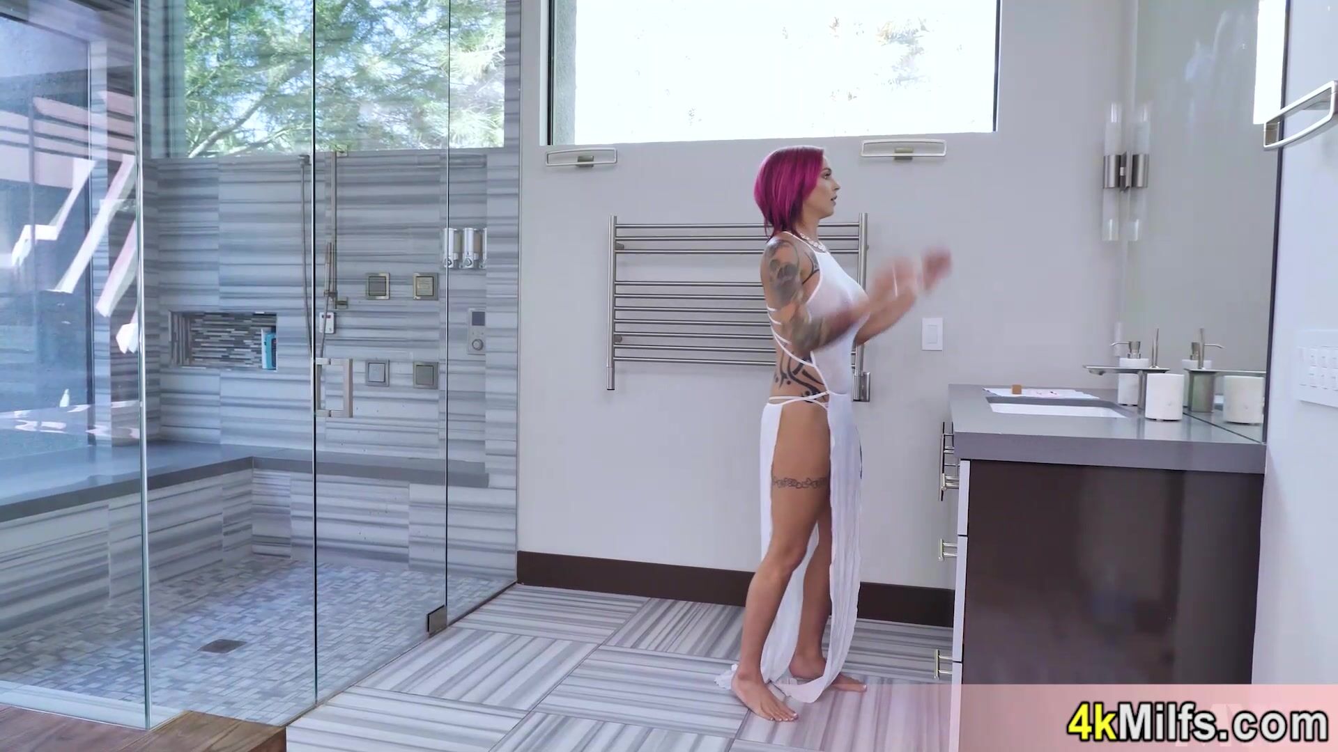 Inked purple haired MILF top model Anna Bell Peaks with big tits and pierced nipples is angry and the cameraman wants to calm her down So he is fingering and fucking the squirter sluts shaved pierced pussy hard after she sucked his big dick