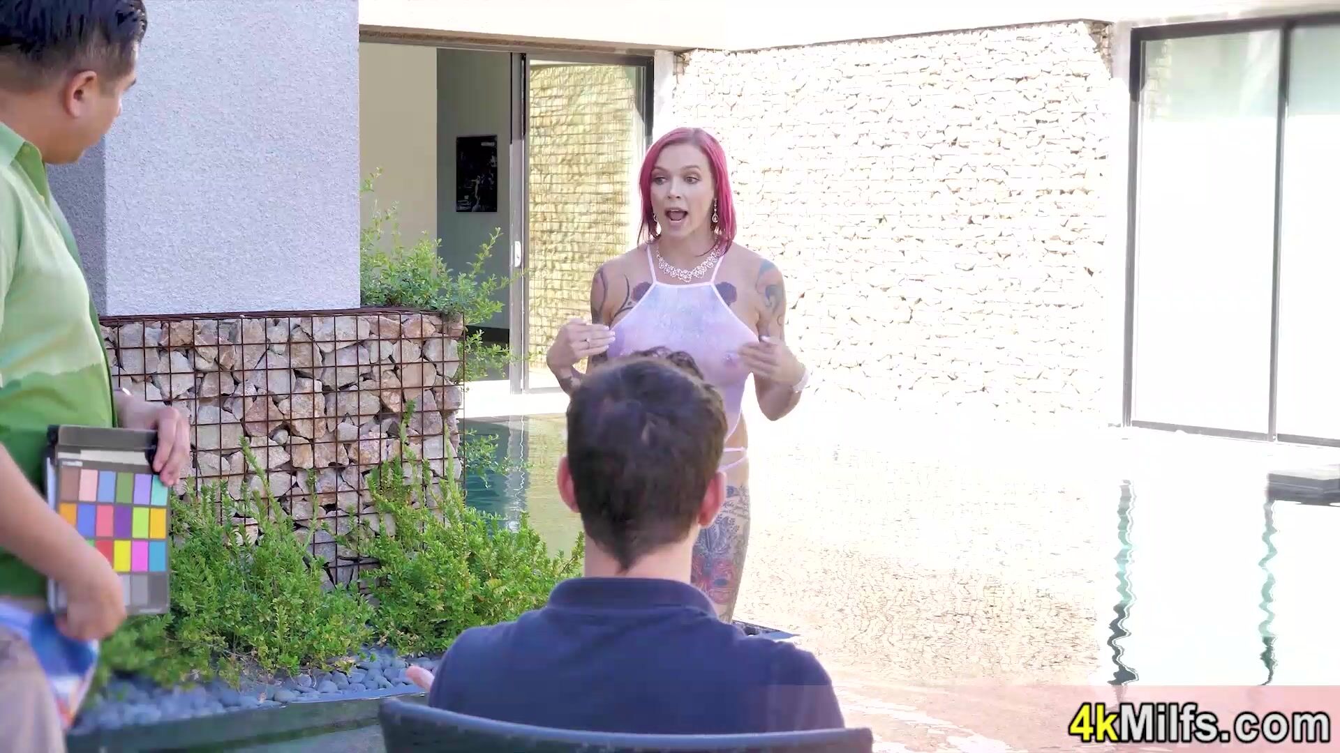 Inked purple haired MILF top model Anna Bell Peaks with big tits and pierced nipples is angry and the cameraman wants to calm her down So he is fingering and fucking the squirter sluts shaved pierced pussy hard after she sucked his big dick