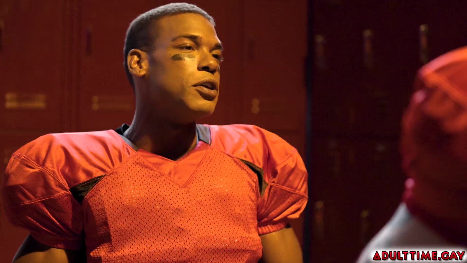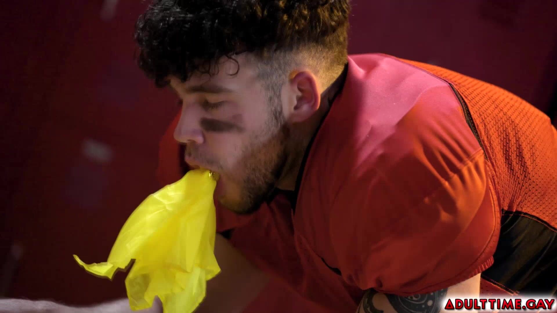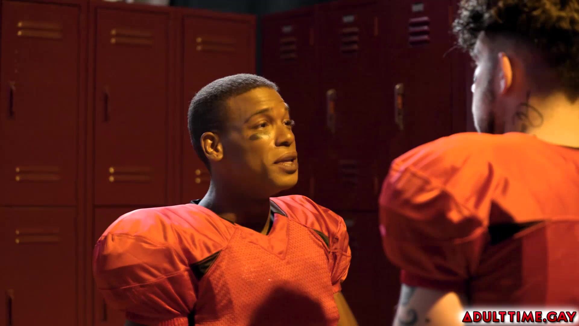 Football players Adrian Hart and Joseph Castillan get into a heated argument in the team's locker room. As they both try to calm down their eyes lock and engage in a fiery kiss that leads them to have hot anal sex.