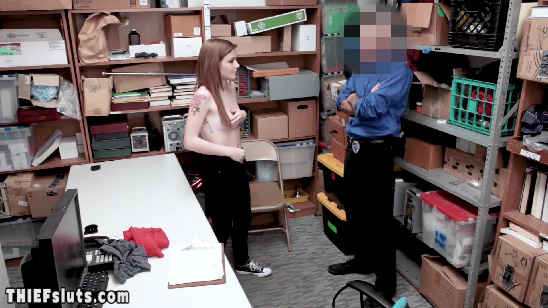 Description: Petite scared brunette teen thief Rosalyn Sphinx with small tits takes off her clothes and a perv LP officer is fucking her pretty face and her shaved pussy to teach her the rules